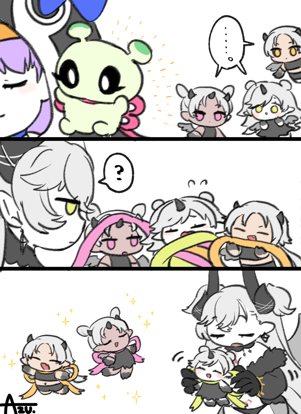... ? animal_hood azu_(kirara310) closed_eyes commentary con_(fate) creature creature_on_shoulder drei_(fate) earrings eins_(fate) fang fate/grand_order fate_(series) grey_hair highres hood horns jealous jewelry lilin_(fate) lilith_(fate) lilith_(third_ascension)_(fate) meltryllis meltryllis_(fate) meltryllis_(swimsuit_lancer)_(fate) meltryllis_(swimsuit_lancer)_(first_ascension)_(fate) on_shoulder penguin_hood pointy_ears purple_hair ribbon signature spoken_ellipsis spoken_question_mark tying_ribbon untranslatable_commentary white_background zwei_(fate)
