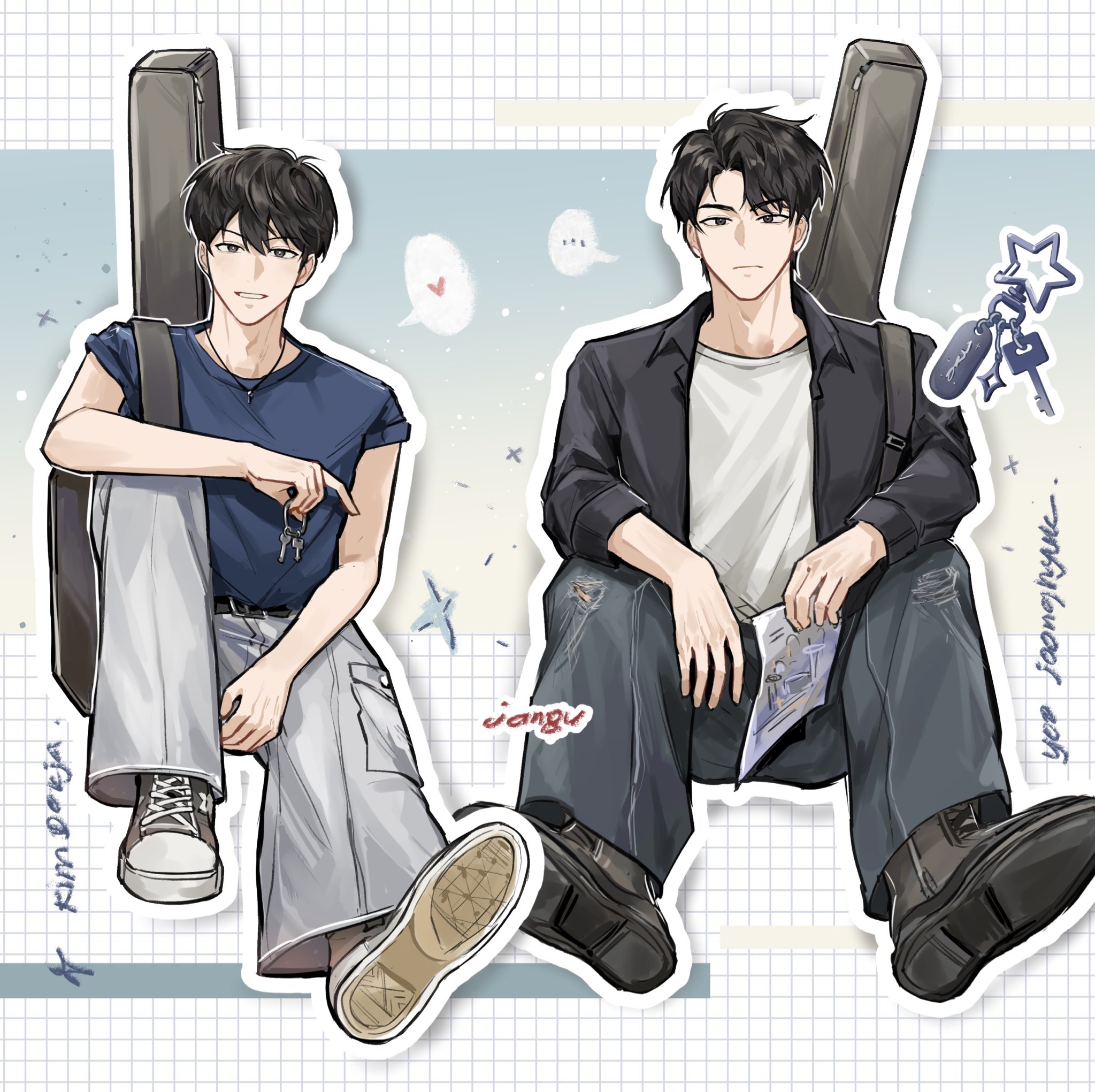 ... 2boys abopikjang black_hair black_jacket blue_shirt denim elbow_on_knee full_body heart highres holding holding_paper instrument_case instrument_case_on_back jacket jeans keyring kim_dokja knee_up looking_at_viewer male_focus multiple_boys omniscient_reader's_viewpoint pants paper shirt short_hair sitting spoken_ellipsis spoken_heart torn_clothes torn_jeans torn_pants white_shirt yoo_joonghyuk