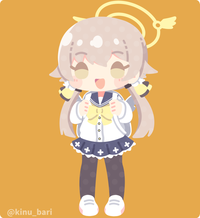 1girl :d backpack bag black_pantyhose blue_archive blue_sailor_collar blue_skirt blush_stickers buttons cardigan commentary_request frilled_skirt frills full_body grey_hair halo hifumi_(blue_archive) kinubari_nerune long_hair long_sleeves low_twintails miniskirt no_lineart open_mouth orange_background pantyhose pleated_skirt polka_dot sailor_collar school_uniform serafuku shoes simple_background skirt smile solo standing twintails twitter_username white_cardigan white_shoes yellow_eyes yellow_halo