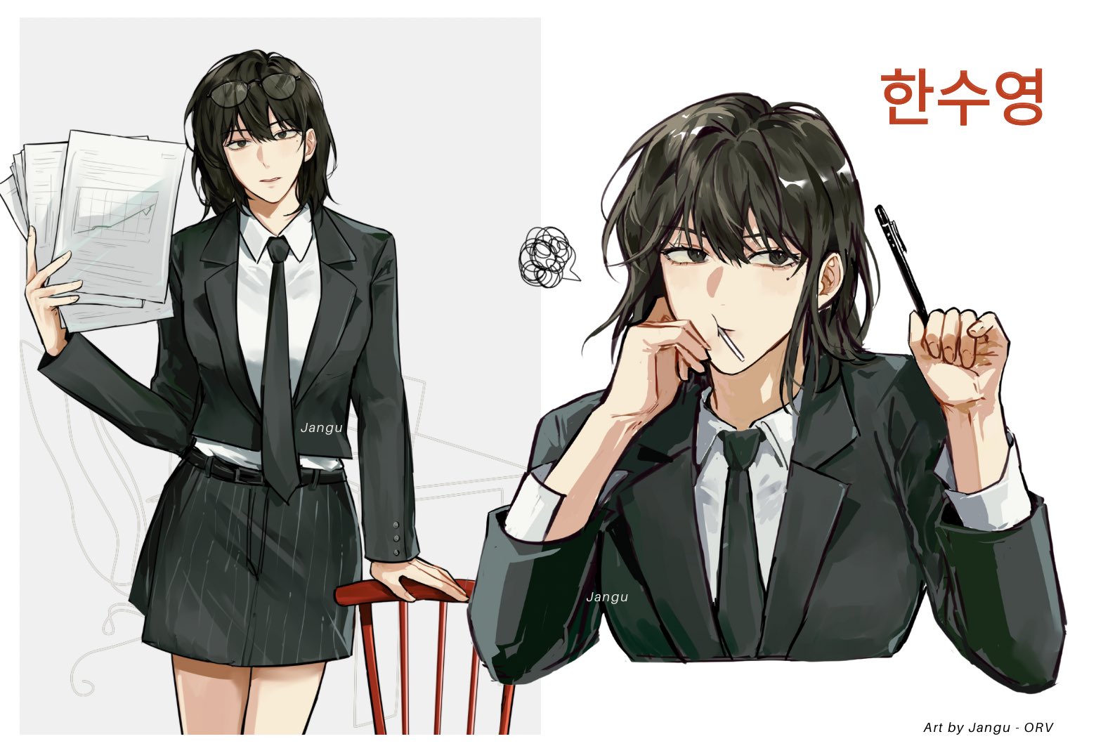 1girl abopikjang aegyo_sal black_eyes black_hair black_jacket black_necktie black_skirt bob_cut candy collared_shirt food food_in_mouth han_sooyoung holding holding_paper holding_pen jacket korean_text lollipop lollipop_in_mouth looking_at_viewer looking_to_the_side mole mole_under_eye multiple_views necktie omniscient_reader's_viewpoint paper pen shirt short_hair skirt suit_jacket translation_request white_shirt