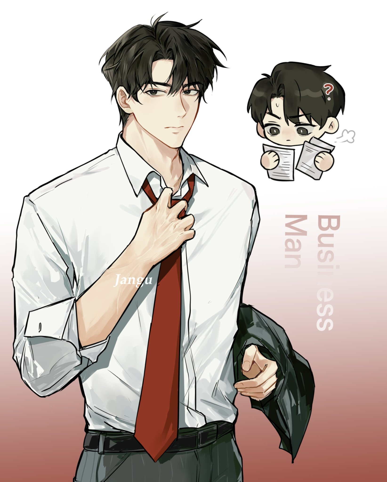 1boy abopikjang adjusting_clothes adjusting_necktie belt black_eyes black_hair black_jacket chibi chibi_inset collared_shirt cowboy_shot curtained_hair highres holding holding_paper jacket jacket_on_arm looking_to_the_side multiple_views necktie omniscient_reader's_viewpoint paper red_necktie shirt shirt_tucked_in short_hair white_shirt yoo_joonghyuk