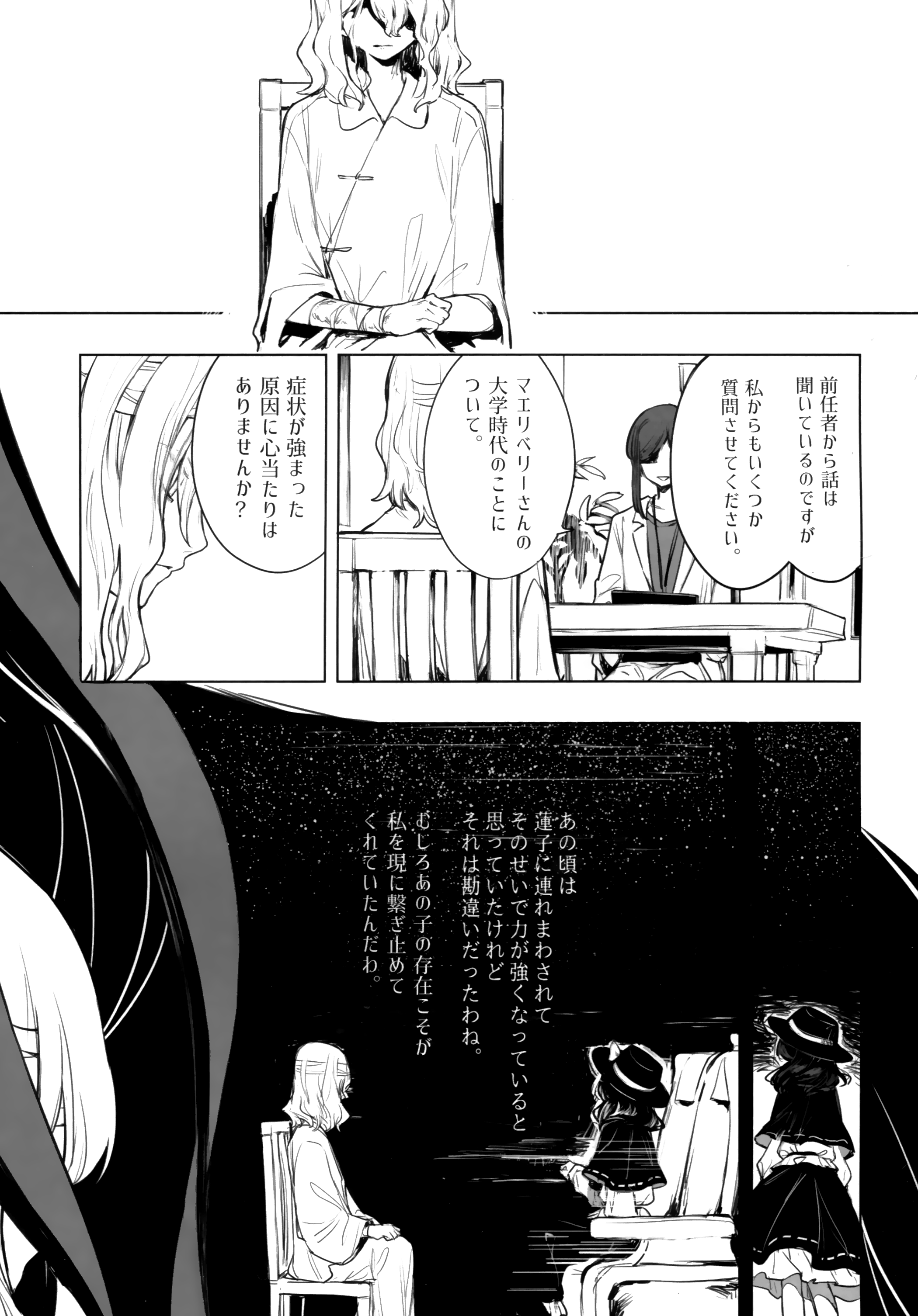 3girls absurdres alternate_costume artist_request bad_source bandaged_arm bandaged_head bandages black_capelet black_hat black_skirt bow capelet chair frilled_skirt frills hat hat_bow highres long_sleeves maribel_hearn medium_hair multiple_girls ribbon-trimmed_skirt ribbon_trim shirt sitting skirt table touhou translation_request usami_renko white_bow white_shirt