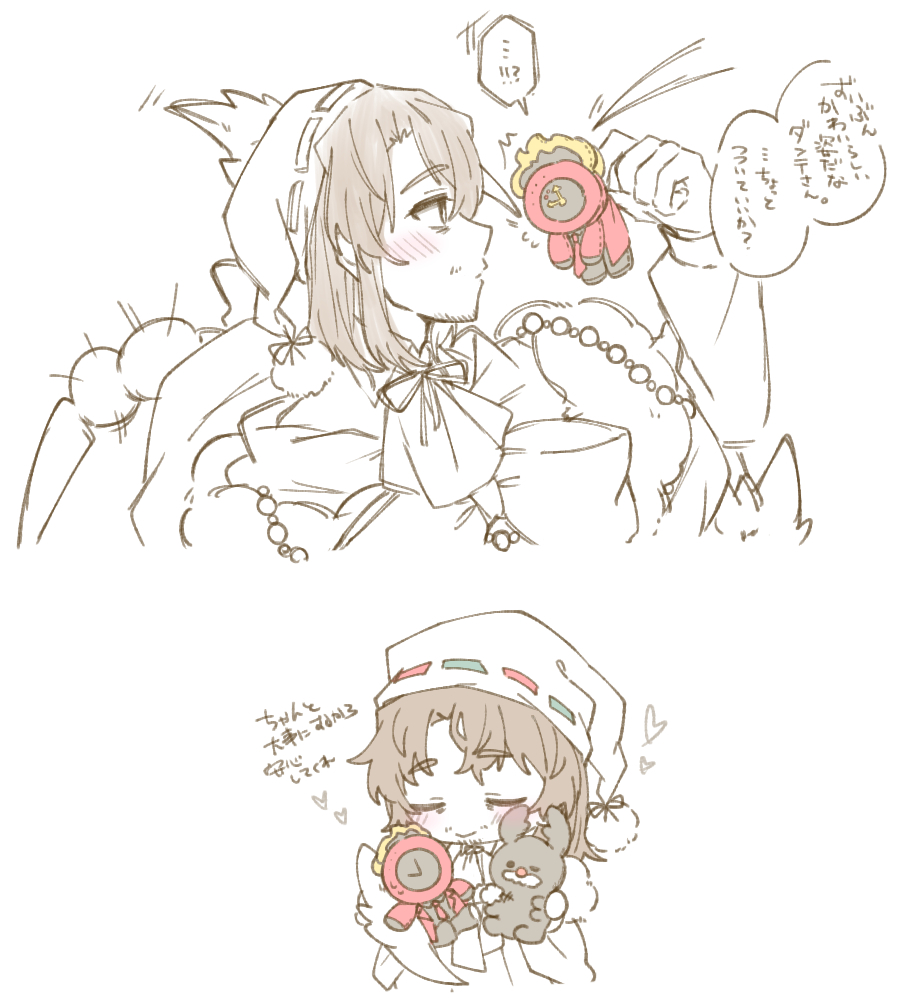 !? ... 1boy 1other 2koma absurdres alternate_costume arthropod_limbs ascot bags_under_eyes beads beard_stubble bell black_fire black_gloves black_pants black_shirt blanket blush bow bowtie brown_hair chain character_doll chest_bow christmas christmas_nightmare_(e.g.o) clock closed_eyes closed_mouth coat collared_dress collared_shirt comic dante_(limbus_company) doll dress e.g.o_(project_moon) extra_arms facial_hair fire fur-trimmed_shawl fur_collar fur_trim gloves green_ribbon gregor_(project_moon) hat heart highres holding holding_doll holding_stuffed_toy lily26983455 limbus_company limited_palette long_hair long_sleeves looking_at_another looking_at_object male_focus monster monster_boy motion_lines multiple_views neck_ribbon necktie nightcap object_head official_alternate_costume pajamas pants parted_bangs partially_colored project_moon red_coat red_necktie red_ribbon ribbon ribbon-trimmed_hat ribbon_trim sentient_stuffed_toy shawl shirt simple_background sketch smile solo speech_bubble stubble stuffed_animal stuffed_reindeer stuffed_toy sweat sweatdrop toy two-tone_ribbon upper_body white_background yaoi yellow_eyes yellow_fire