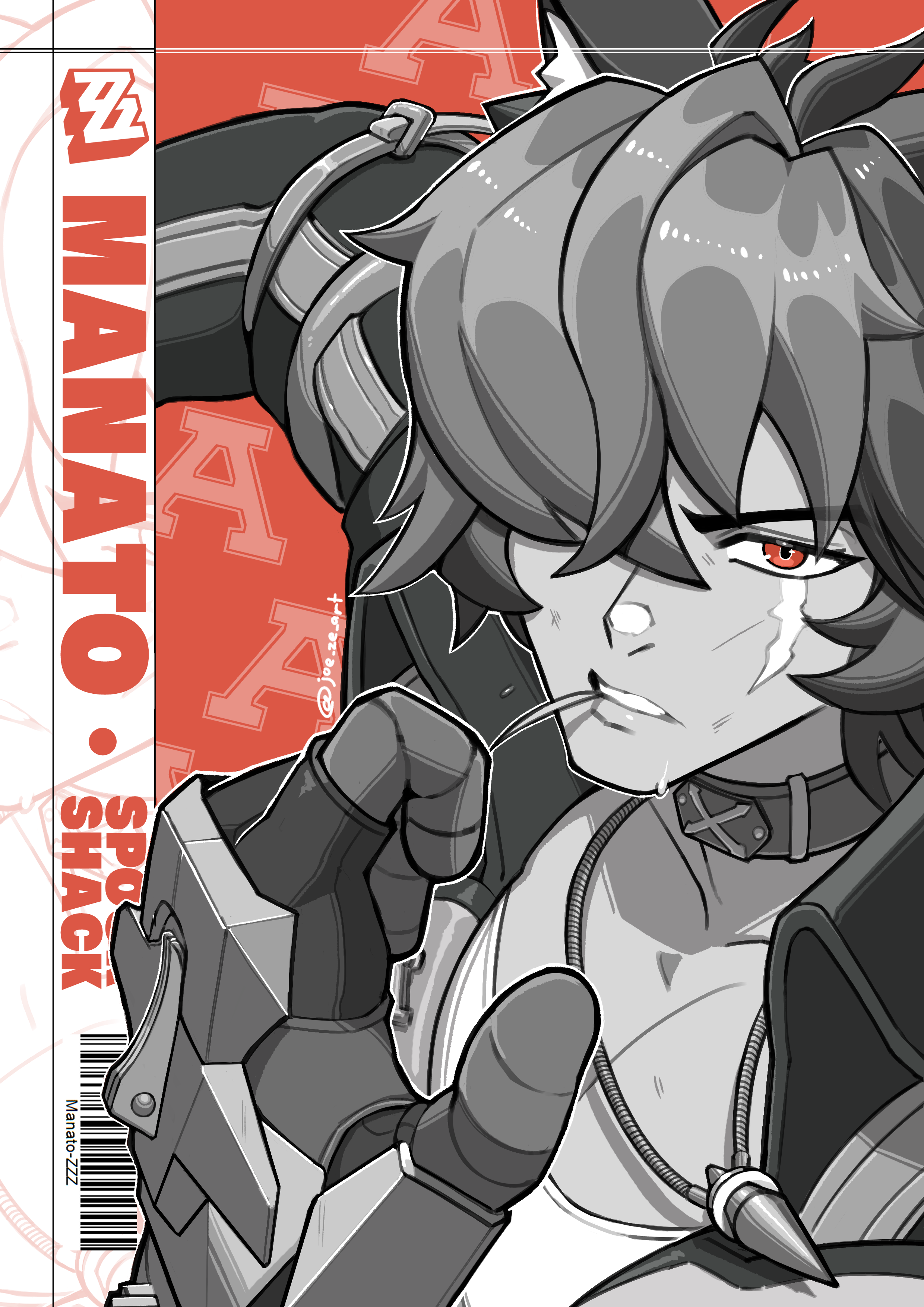 1boy absurdres animal_ear_fluff animal_ears barcode black_jacket character_name clenched_teeth clip_studio_paint_(medium) collar collarbone commentary dog_boy dog_ears english_commentary greyscale_with_colored_background hair_over_one_eye hand_up highres jacket joe_westbrook komano_manato leaf_in_mouth looking_at_viewer male_focus parted_lips portrait red_background red_eyes scar scar_on_face short_hair solo spot_color teeth zenless_zone_zero
