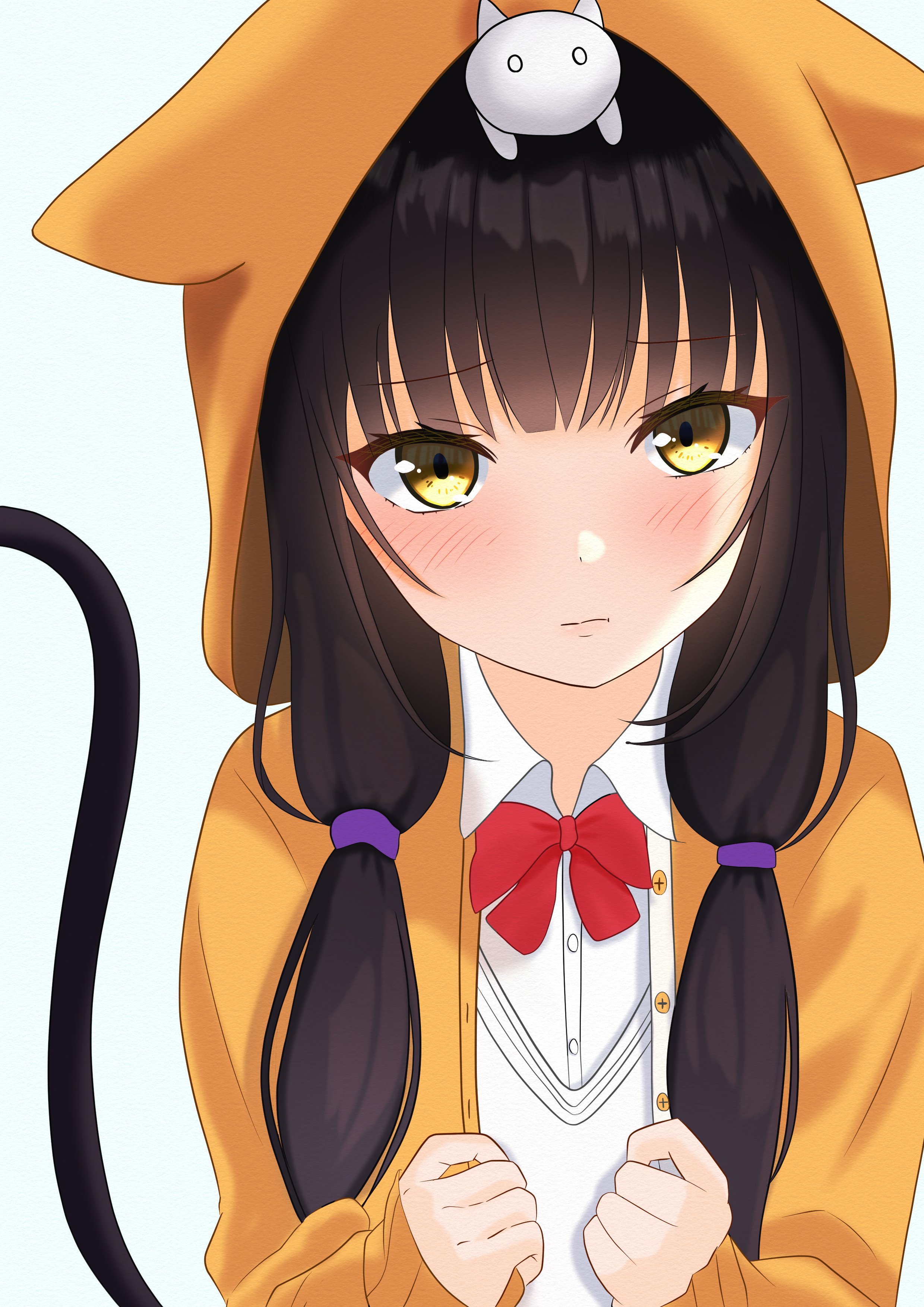 1girl :t absurdres animal animal_on_head asakura_karen_(heaven_burns_red) black_hair blunt_bangs blush bow bowtie cat cat_on_head cat_tail clenched_hands closed_mouth collared_shirt eyelashes furrowed_brow heaven_burns_red highres hood hood_up hoodie long_hair looking_at_viewer low_twintails luck_hebuban on_head open_clothes open_hoodie orange_hoodie pout red_bow red_bowtie shirt simple_background sleeves_past_wrists solo split_mouth tail tail_raised twintails upper_body white_background white_shirt yellow_eyes