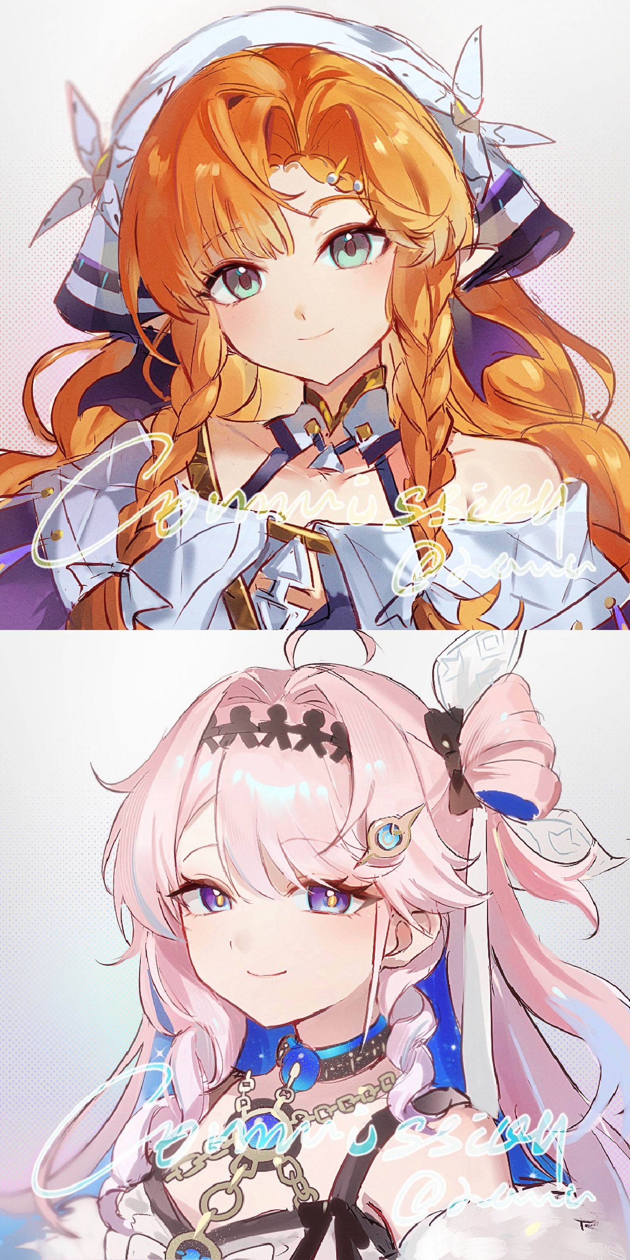 2girls absurdres ahoge aqua_eyes black_bow black_hairband bow braid braided_sidelocks chain chinese_commentary collarbone colored_inner_hair commentary_request commission denia_(wuthering_waves) english_text hairband highres jacket kaima_ishikawa long_hair multicolored_hair multicolored_jacket multiple_girls off-shoulder_jacket off_shoulder orange_hair pink_hair pointy_ears purple_eyes purple_jacket sidelocks sigrika_(wuthering_waves) two-tone_jacket upper_body veil white_veil wuthering_waves