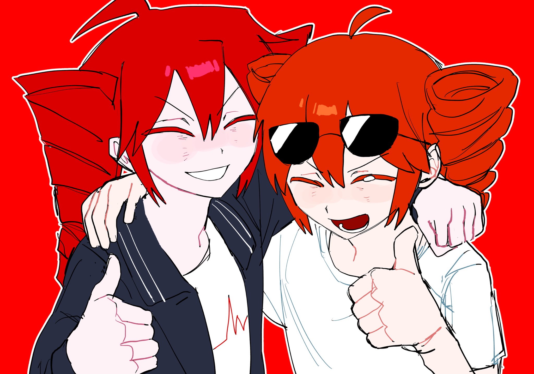 2girls :d ahoge black_jacket colored_eyelashes commentary_request creator_connection drill_hair eyewear_on_head hair_between_eyes hand_on_another's_shoulder highres jacket kasane_teto korean_commentary liar_dancer_(synthesizer_v) medium_hair multiple_girls open_clothes open_jacket open_mouth portrait red_background red_hair red_theme shirt smile sunglasses thumbs_up twin_drills ultra_trailer_(synthesizer_v) waguwagu090908 white_shirt