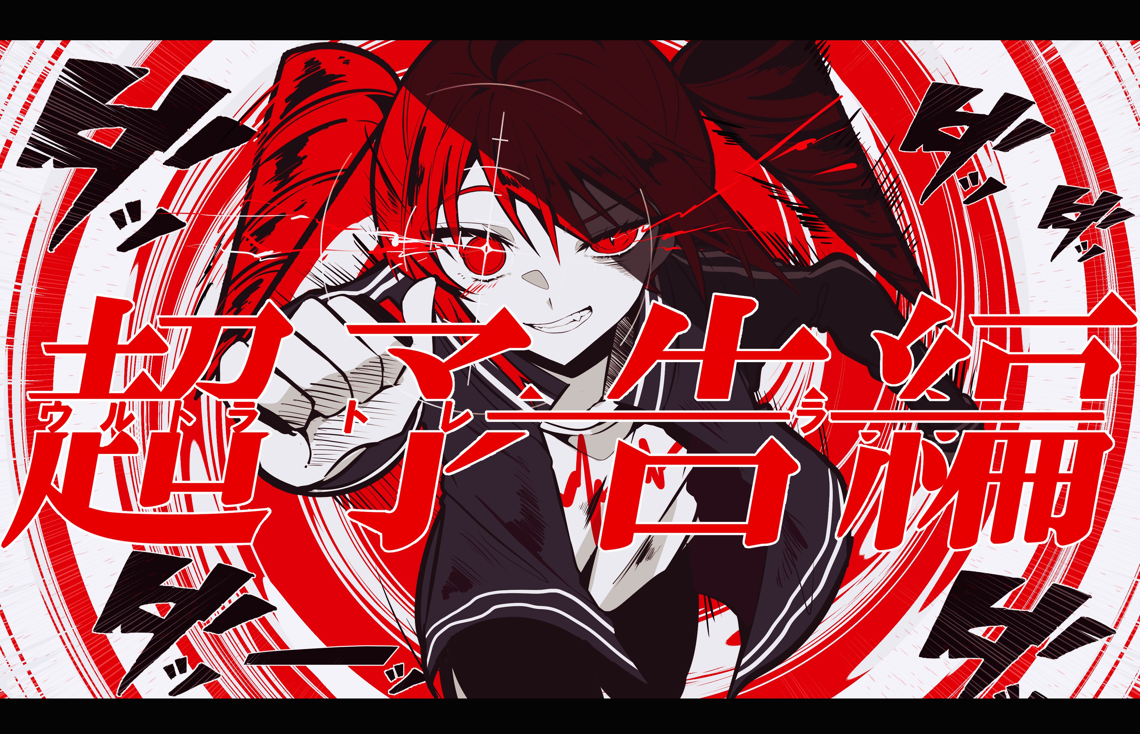 1girl absurdres ahoge black_jacket black_pants clenched_hands clenched_teeth commentary drill_hair glowing glowing_eyes highres jacket kasane_teto looking_at_viewer medium_hair mizuame_(mi_rei_817) pants red_eyes red_hair red_theme running scope shirt solo song_name synthesizer_v teeth translation_request twin_drills ultra_trailer_(synthesizer_v) untranslatable_commentary white_shirt