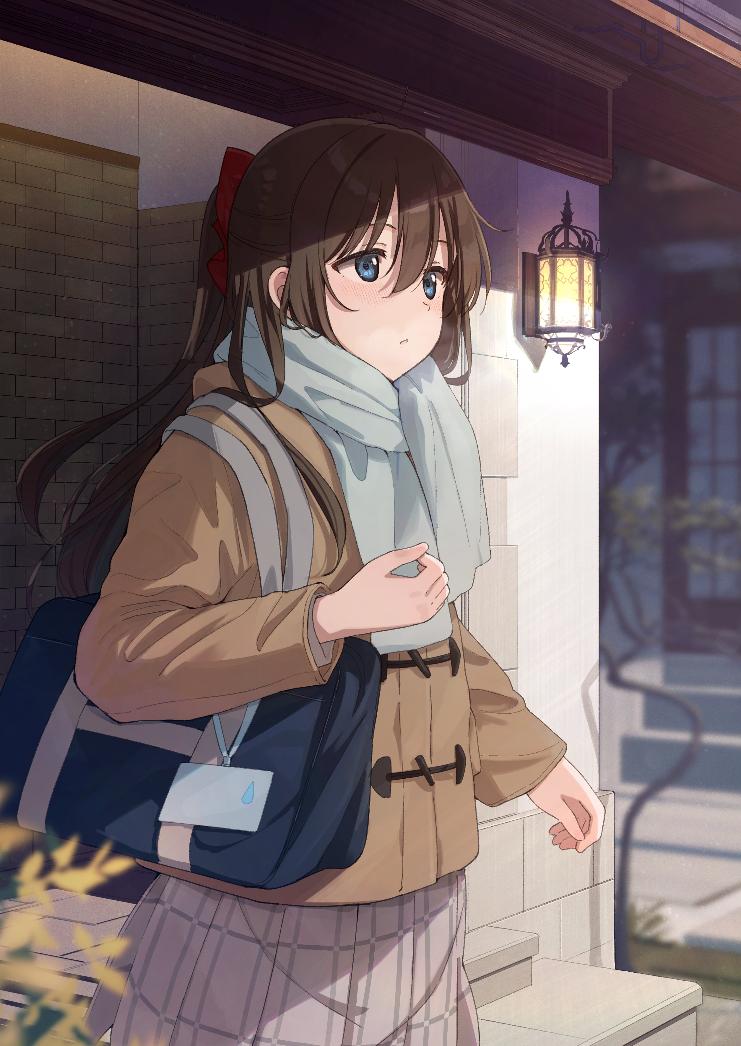 1girl absurdres bag blue_eyes brown_coat brown_hair coat commentary_request hair_ribbon highres lantern light_blush long_hair long_sleeves love_live! love_live!_nijigasaki_high_school_idol_club nijigasaki_school_uniform osaka_shizuku outdoors plaid_clothes plaid_skirt ponytail red_ribbon ribbon scarf school_bag school_uniform skirt solo tata_(tataice) white_scarf white_skirt winter_clothes