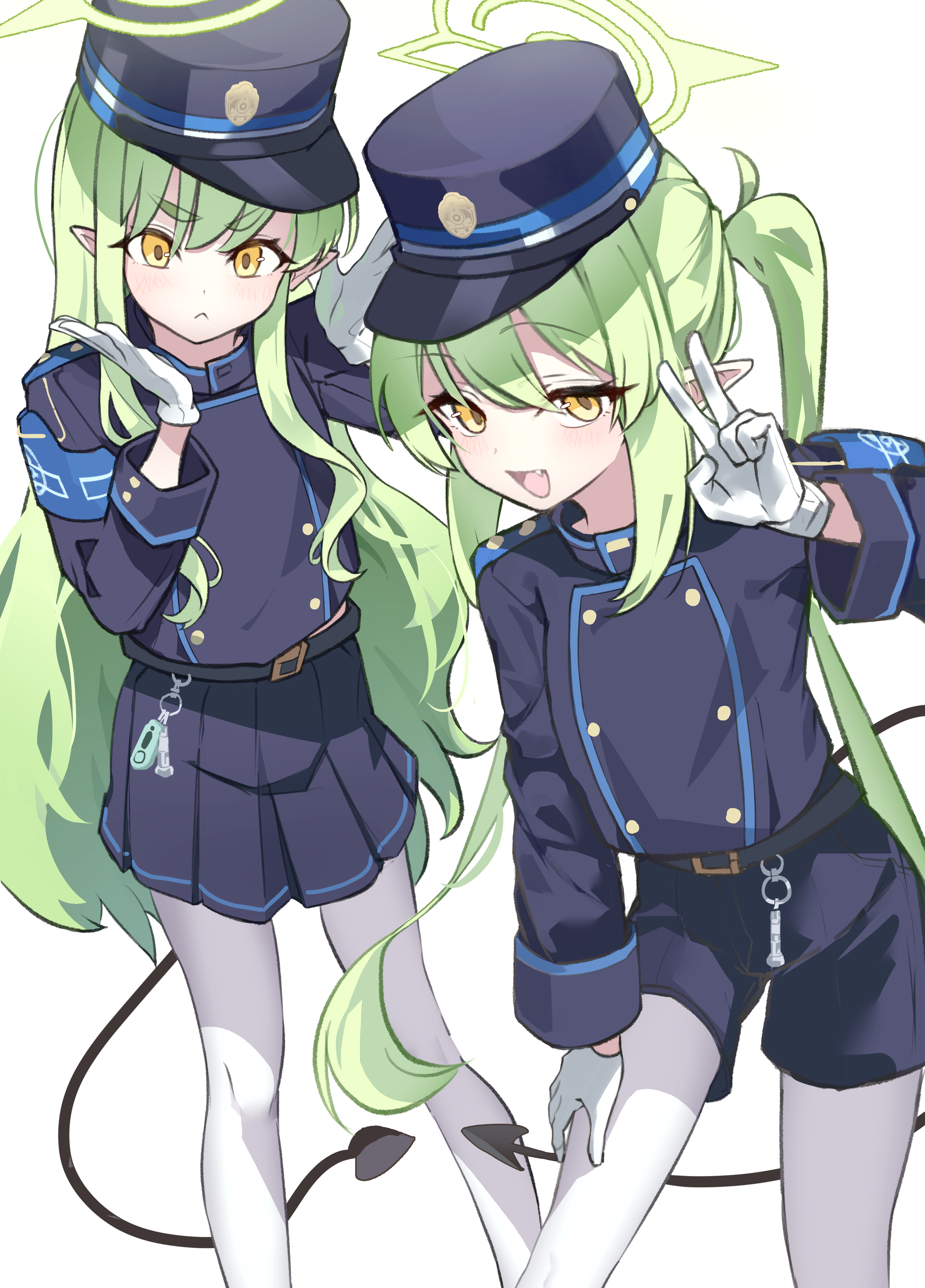 2girls :< :d absurdres armband black_hat black_shorts black_skirt blue_archive blue_armband commentary_request demon_tail fang gloves green_hair halo hand_on_own_thigh hat highres hikari_(blue_archive) kario long_hair multiple_girls nozomi_(blue_archive) open_mouth pantyhose peaked_cap pleated_skirt pointy_ears shorts siblings simple_background sisters skirt smile tail twins twintails v white_background white_gloves white_pantyhose yellow_eyes