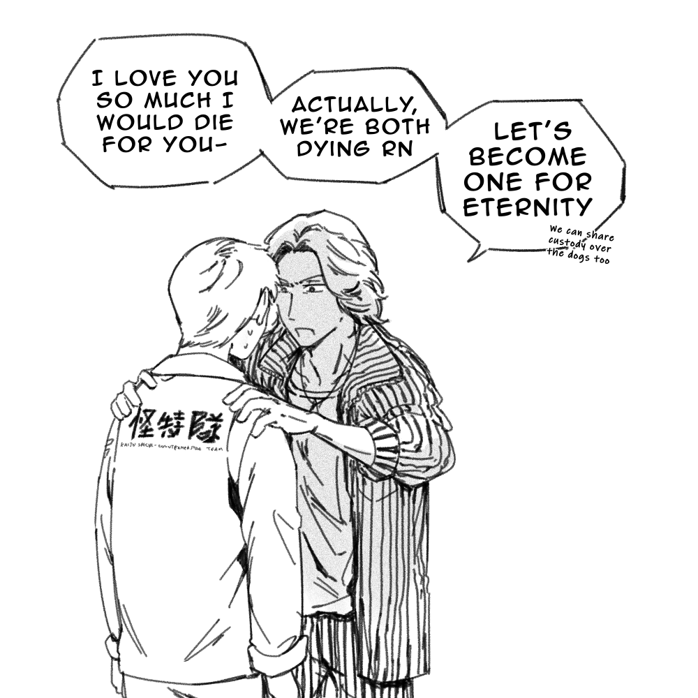 2boys commentary english_commentary english_text greyscale hands_on_another's_shoulders hoshimi_kousei jacket looking_at_another male_focus medium_hair monochrome multiple_boys nezz_(fruitpunchn) ookida_sorato open_mouth pants shirt simple_background sleeves_rolled_up speech_bubble sweatdrop ultra_series ultraman_omega_(series) yaoi