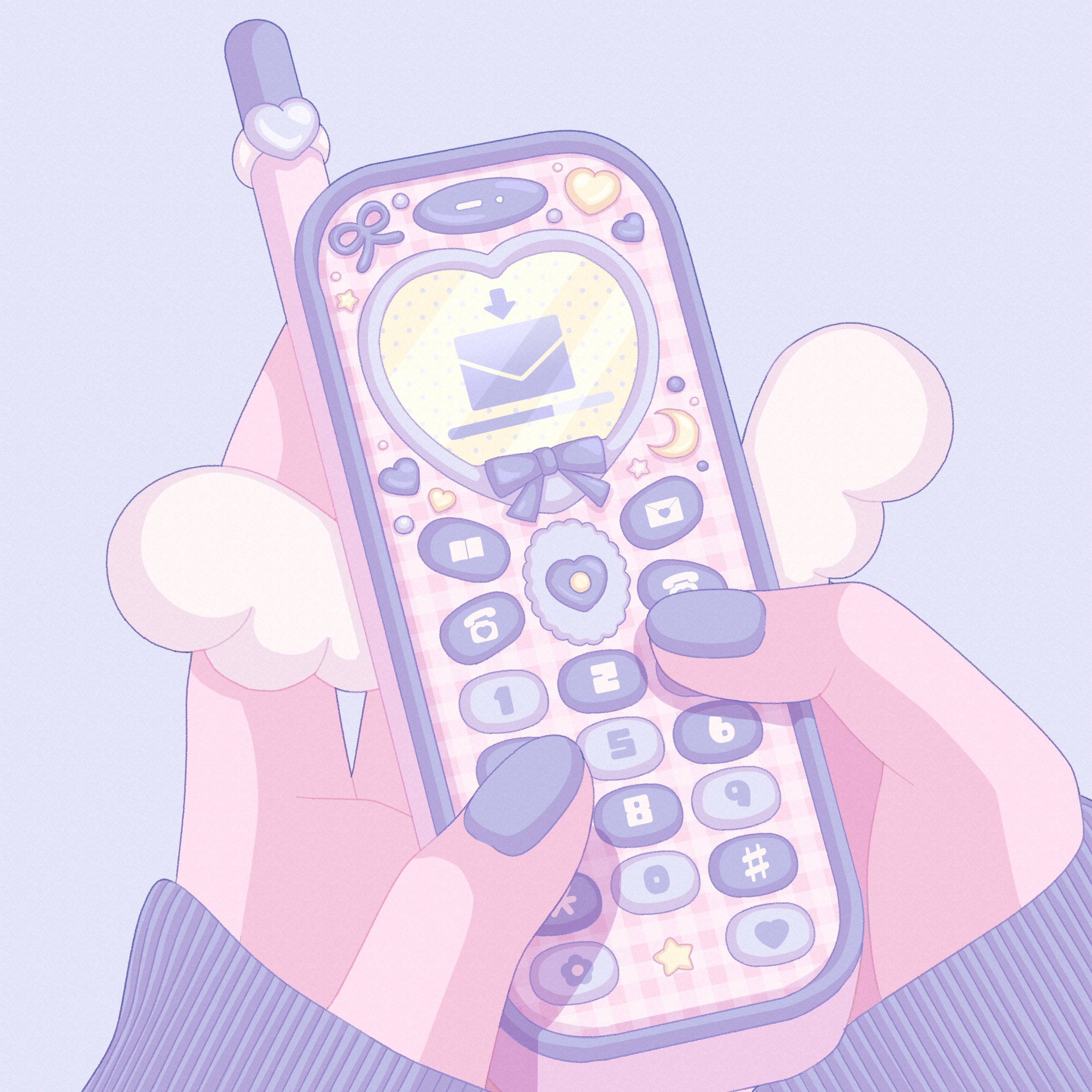 1girl absurdres bar_phone bow bow_print cellphone commentary crescent_print hand_focus heart heart_print highres holding holding_phone long_sleeves nekomaru0817 original pastel_colors phone pov pov_hands purple_background purple_bow purple_nails purple_sleeves simple_background solo star_(symbol) star_print untranslatable_commentary