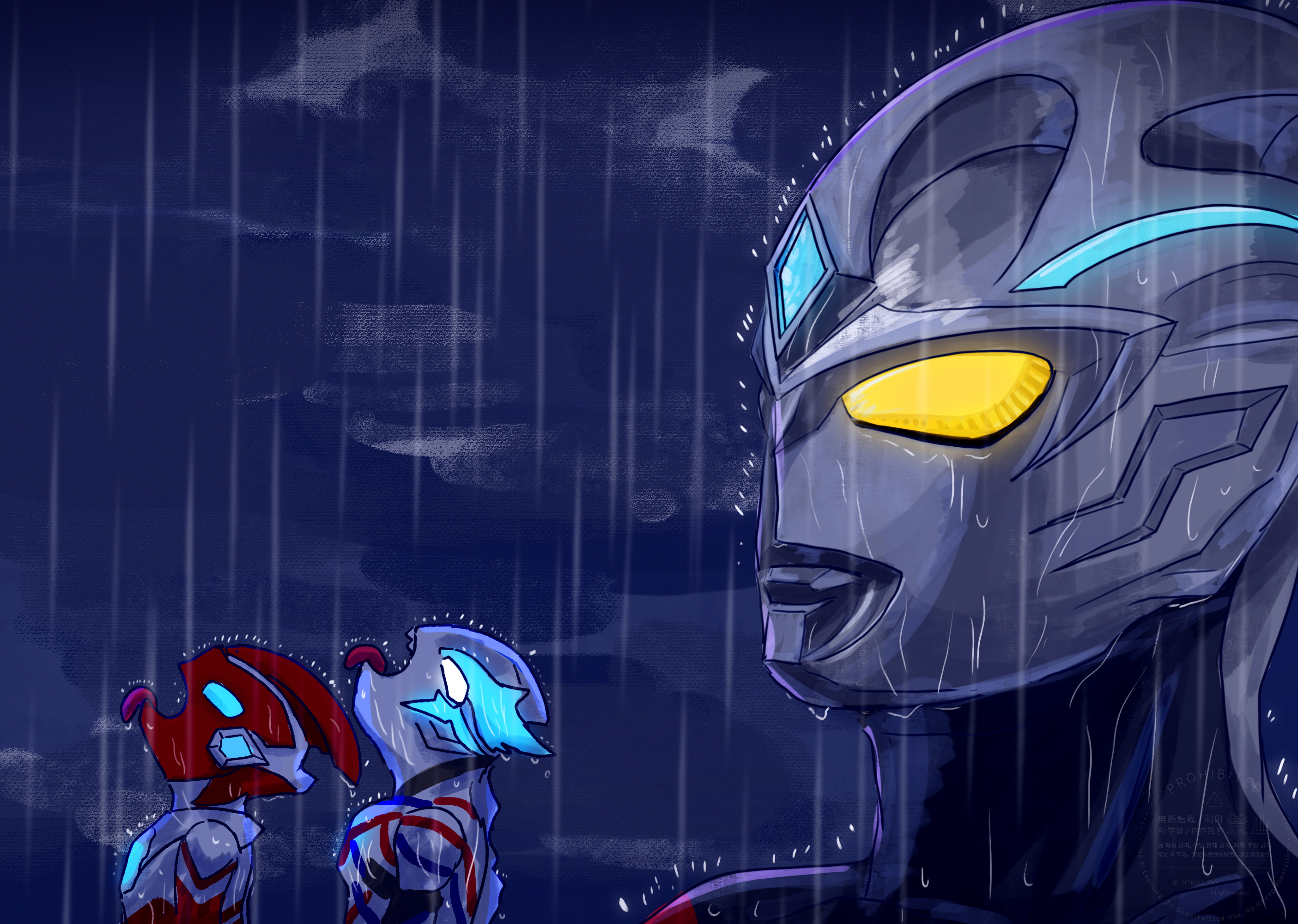 3boys alien black_skin blue_eyes blue_gem blue_horns blue_skin chest_guard color_timer colored_skin commentary english_commentary forehead_jewel gem glowing glowing_eyes glowing_gem goku_and_vegeta_in_the_rain_(meme) head_back highres horns looking_up meme multicolored_skin multiple_boys night no_pupils open_mouth outdoors rain red_skin silver_skin simazu_xxx tokusatsu tongue tongue_out ultra_series ultraman_arc ultraman_arc_(series) ultraman_blazar ultraman_blazar_(series) ultraman_omega ultraman_omega_(series) wet white_eyes yellow_eyes