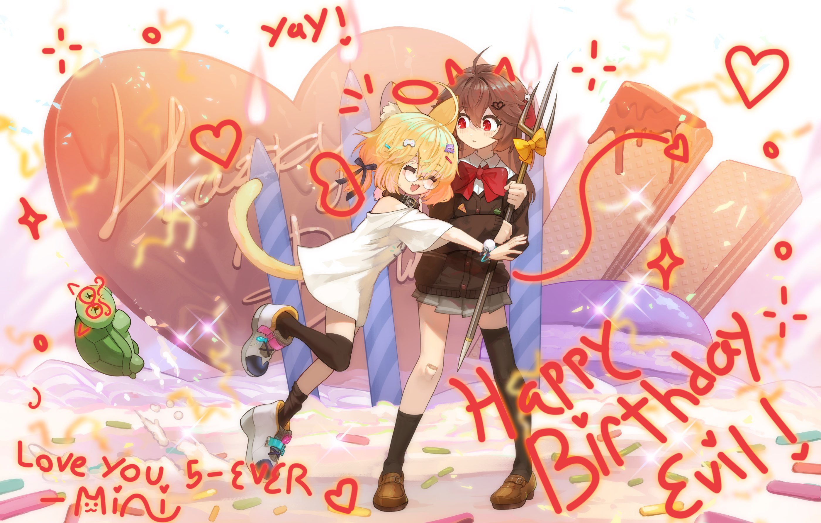 1boy 2girls ahoge animal_ears asymmetrical_legwear badge bandaid bandaid_on_knee bandaid_on_leg black_cardigan black_collar black_socks black_thighhighs blonde_hair bow bowtie broken_heart broken_heart_hair_ornament brown_shoes button_badge cake candle cardigan cat_ears cat_girl cat_tail closed_eyes collar commentary commission dress_shirt english_commentary evil_neuro-sama food full_body grey_skirt hair_between_eyes happy_birthday heart highres holding_harpoon hug indie_virtual_youtuber loafers long_hair long_sleeves minikomew miniskirt multiple_girls neuro-sama off-shoulder_cardigan open_mouth pleated_skirt red_bow red_bowtie red_eyes shirt shoes skirt socks standing tail tanziya_(codlxcold) thighhighs third-party_source turtle uneven_legwear vedal987 vedal_ai virtual_youtuber white_shirt wide_shot