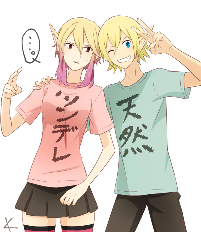 ... 1boy 1girl afin arm_around_shoulder arm_up black_pants black_skirt blonde_hair blue_eyes blush breasts commentary_request cowboy_shot embarrassed euclita_(pso2) gradient_hair green_shirt grin hair_between_eyes hand_on_another's_shoulder kanade_(unchi_knd280) long_pointy_ears miniskirt multicolored_hair newman one_eye_closed pants phantasy_star phantasy_star_online_2 pink_hair pink_shirt pointy_ears print_shirt red_eyes shirt short_hair short_sleeves siblings sidelocks simple_background skirt smile spoken_ellipsis sweatdrop thighhighs translation_request two-tone_hair v v-shaped_eyebrows white_background