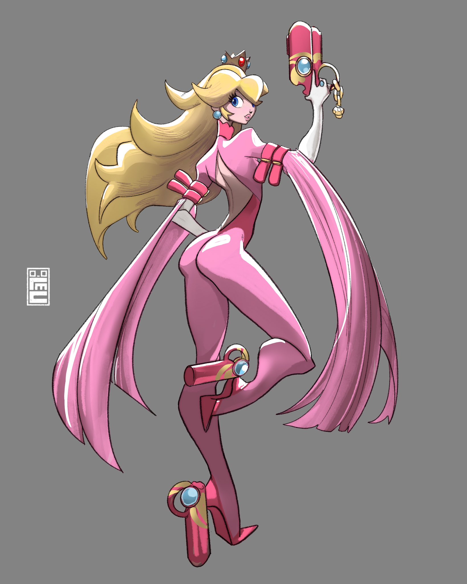 1girl ankle_gun artist_logo bare_back bayonetta bayonetta_(cosplay) blonde_hair bodysuit boots commentary cosplay eyelashes facing_to_the_side flat_chest from_behind gloves grey_background gun hair_between_eyes hand_on_own_hip hand_up high_heel_boots high_heels highres holding holding_gun holding_weapon knee_up logo long_hair long_legs looking_at_viewer mario_(series) miguel_sanchez narrow_waist nintendo pink_bodysuit princess_peach profile simple_background weapon