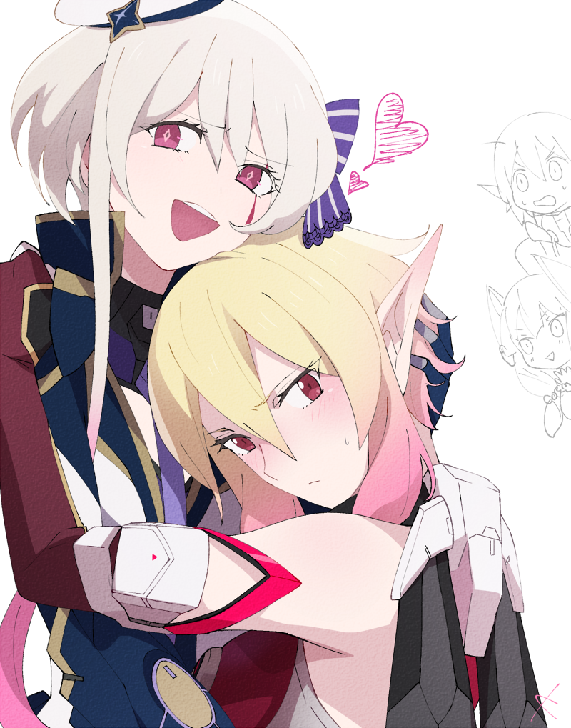 1boy 3girls afin aurora_(pso2) bare_shoulders blonde_hair blue_gloves blue_jacket blush bow commentary_request diamond-shaped_pupils diamond_(shape) elbow_gloves euclita_(pso2) facepaint gloves gradient_hair hair_between_eyes hair_bow hand_on_another's_head hand_on_another's_shoulder hat heart hug jacket kanade_(unchi_knd280) long_sleeves looking_at_viewer multicolored_hair multiple_girls newman open_mouth original phantasy_star phantasy_star_online_2 pink_eyes pink_hair purple_bow red_eyes short_hair sidelocks smile striped_bow sweatdrop symbol-shaped_pupils two-tone_hair white_background white_hair yuri