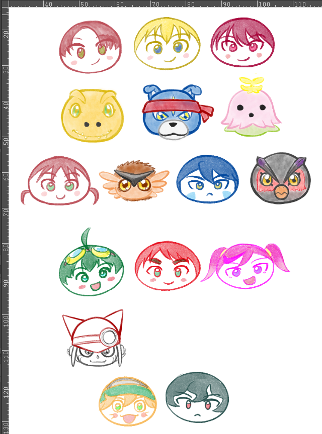 agumon_(digimon_savers) asuka_torajirou beak daimon_chika daimon_masaru_(digimon_savers) digimon digimon_(creature) expressionless falcomon fujieda_yoshino gaogamon gatchmon goggles goggles_on_head hikaru_0025 karan_eri katsura_rei lalamon looking_at_viewer noguchi_ikuto ozora_yujin puwamon shinkai_haru smile thoma_h._norstein