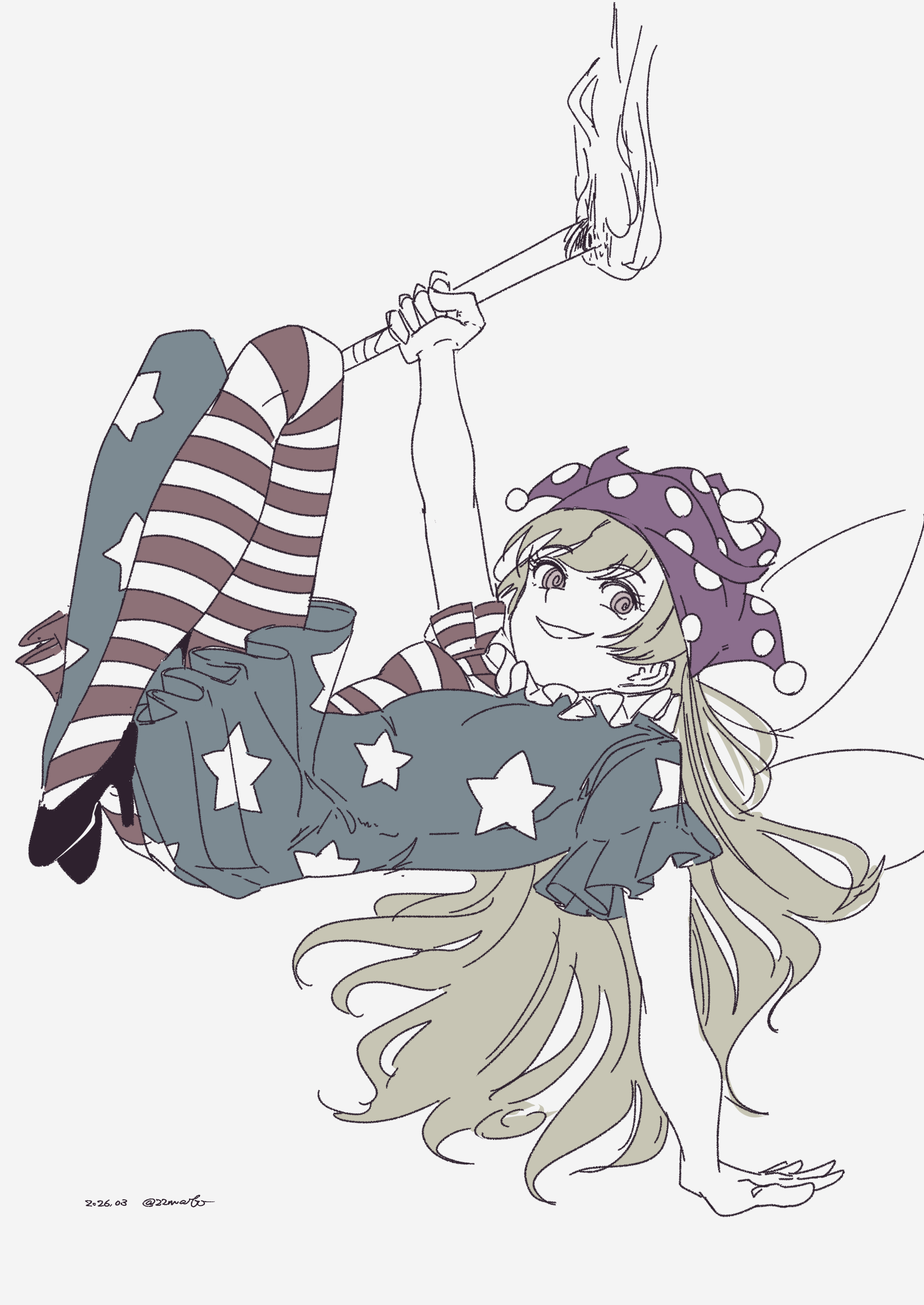 1girl absurdres american_flag_dress american_flag_legwear arm_up artist_name beads black_shoes blonde_hair breasts clownpiece commentary_request dated dress fairy_wings fire full_body hat high_heels highres holding holding_torch jester_cap long_hair looking_at_viewer lying ma_(22mabo) medium_breasts neck_ruff on_back pale_skin pantyhose pink_eyes polka_dot_headwear purple_hat ringed_eyes shoes short_sleeves simple_background smile solo star_(symbol) star_print striped_clothes striped_dress striped_pantyhose teeth torch touhou wavy_hair white_background wings