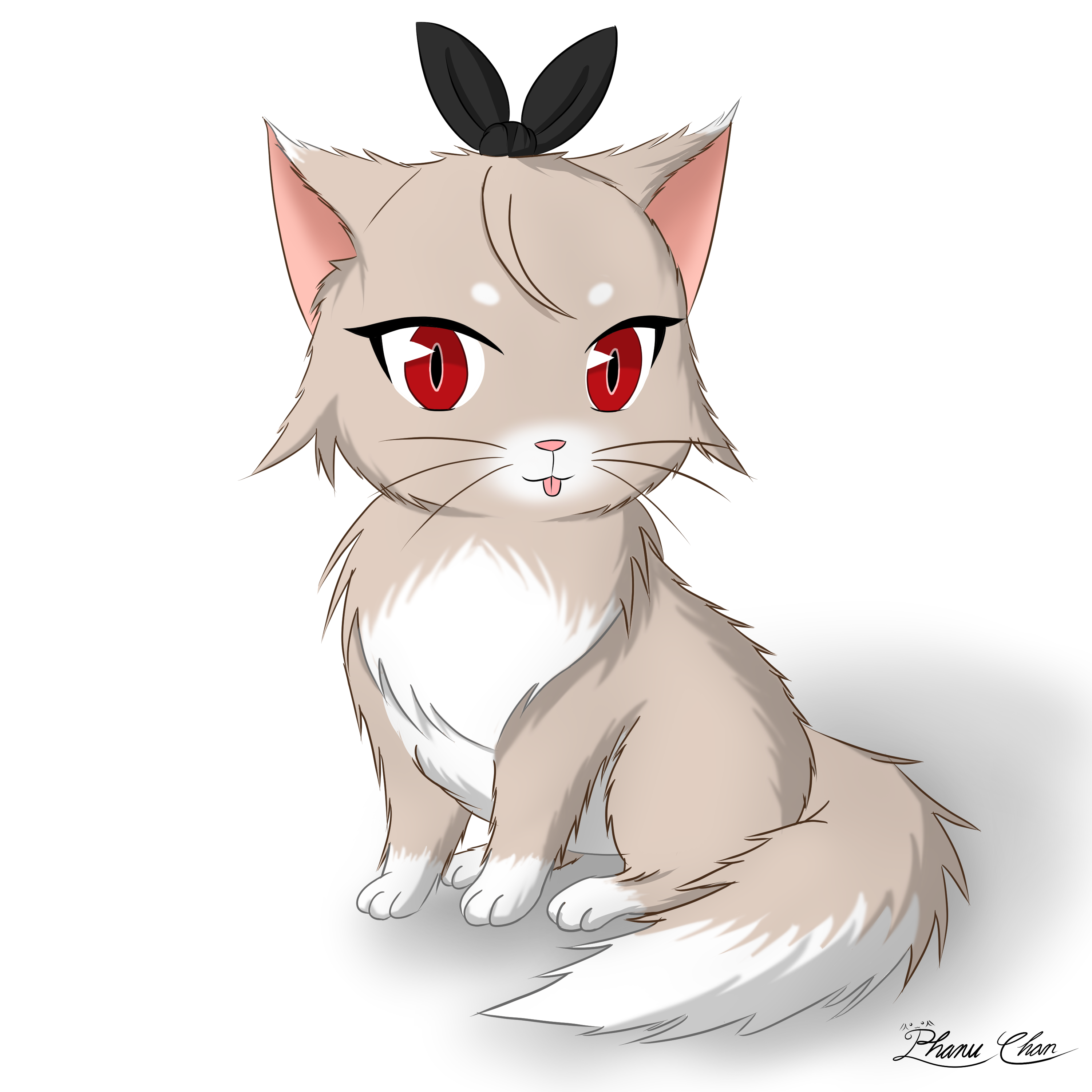 :3 :p absurdres animalization artist_name black_ribbon cat cat_day closed_mouth commentary english_commentary eydis_(sao) full_body highres no_humans phanuchan red_eyes ribbon signature simple_background smile sword_art_online sword_art_online:_alicization sword_art_online:_unleashed_blading tongue tongue_out white_background