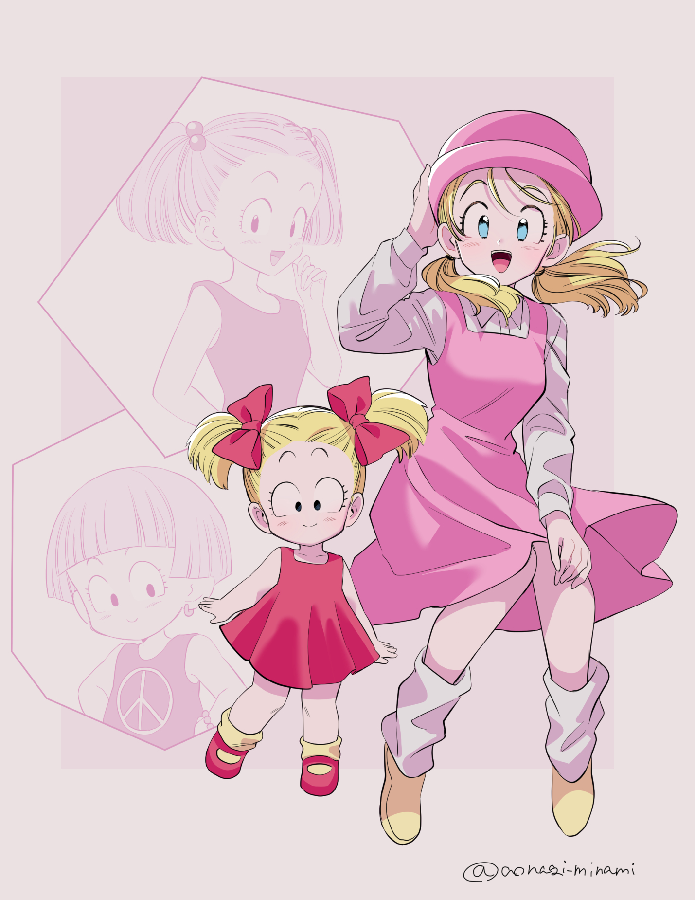 4girls :d aonagi_minami arm_up black_eyes blonde_hair blue_eyes blunt_bangs blush border bow child closed_mouth commentary dragon_ball dragon_ball_gt dragon_ball_super dragonball_z dress earrings hair_bobbles hair_bow hair_ornament hand_on_headwear hand_on_own_hat hand_up happy hat highres invisible_chair invisible_floor jewelry long_hair long_sleeves looking_at_viewer loose_socks marron_(dragon_ball) multiple_girls multiple_persona open_mouth outside_border peace_symbol pinafore_dress pink_dress pink_hat red_bow red_dress red_shoes shirt shoes short_hair sitting sleeveless sleeveless_dress smile socks standing teeth twintails twitter_username upper_teeth_only white_shirt white_socks yellow_shoes yellow_socks