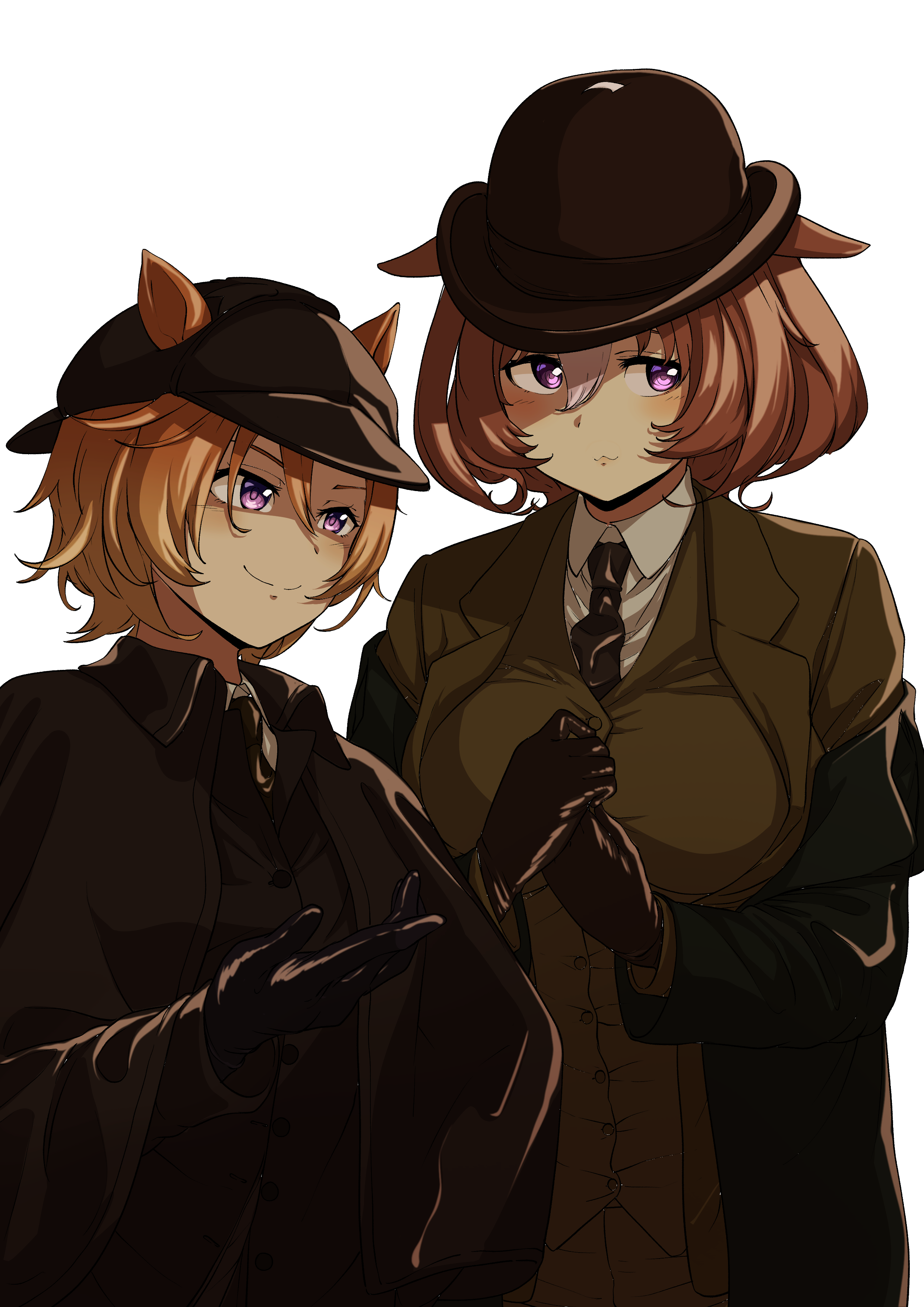 2girls absurdres alternate_costume animal_ears black_coat black_gloves black_necktie black_vest blush bowler_hat breasts brown_coat brown_hair brown_hat brown_vest closed_mouth coat collared_shirt commentary_request cosplay deerstalker detective ears_through_headwear gloves hair_between_eyes hat highres horse_ears horse_girl john_hamish_watson john_hamish_watson_(cosplay) kaede_(harutan109) large_breasts long_sleeves medium_hair meisho_doto_(umamusume) multicolored_hair multiple_girls necktie orange_hair purple_eyes sherlock_holmes sherlock_holmes_(cosplay) shirt short_hair simple_background smile t.m._opera_o_(umamusume) the_adventures_of_sherlock_holmes two-tone_hair umamusume vest white_background white_shirt