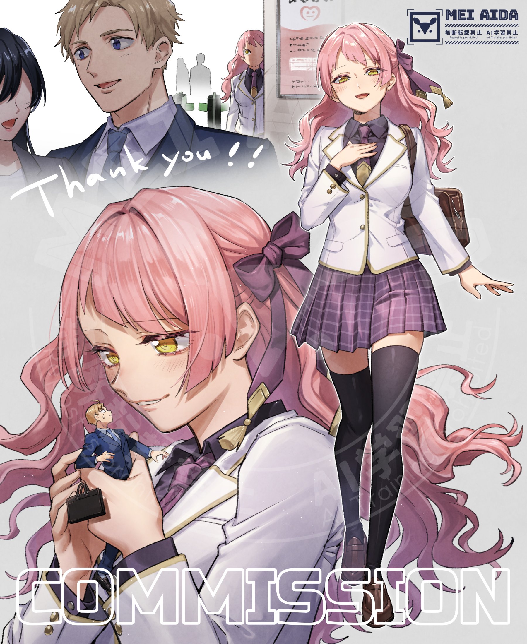1boy 2girls aida_mei alternate_costume around_corner artist_name bag black_hair black_shirt black_thighhighs blazer blonde_hair blue_necktie blue_suit bow briefcase business_suit collared_shirt commentary_request commission contemporary faceless faceless_female formal_clothes from_side full_body hair_bow hair_intakes hair_ribbon hand_on_own_chest hetero highres holding holding_mini_person jacket jealous long_hair looking_at_another majo_to_kekkon_nante_suru_mon_ja_nai! mini_person miniboy mole mole_under_eye multiple_girls multiple_views necktie no_eyes one_eye_in_shadow peeking_out pink_hair purple_bow purple_necktie purple_ribbon purple_skirt ribbon school_bag school_uniform shirt shrinking signature silhouette size_difference skeb_commission skirt small_sweatdrop smile suit tassel thighhighs watermark wavy_hair white_jacket yellow_eyes zettai_ryouiki