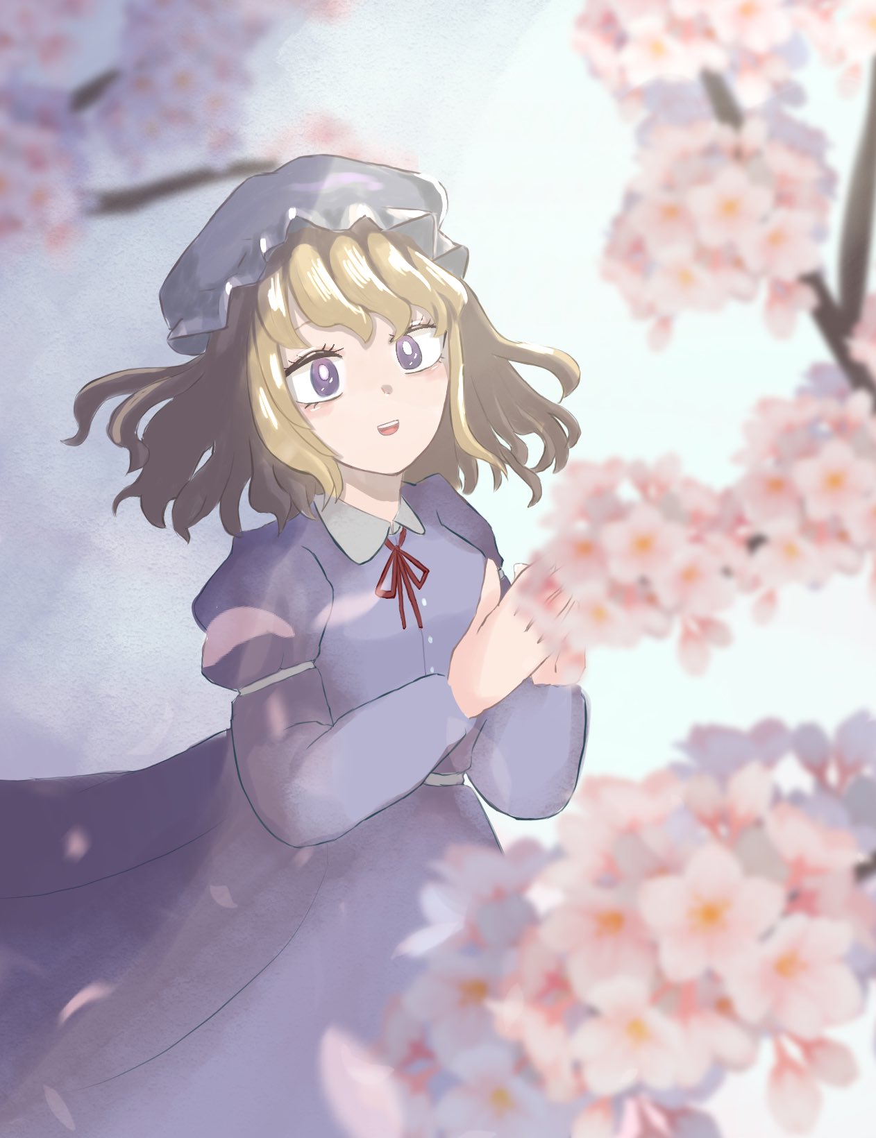 blonde_hair blush buttons collared_dress contrast_collar dress enuchi_(jvdm7888) flower_request gift_art hat highres long_sleeves maribel_hearn medium_hair mob_cap neck_ribbon open_mouth own_hands_together purple_dress purple_eyes red_ribbon ribbon sash sleeve_garter teeth touhou upper_teeth_only white_hat white_sash