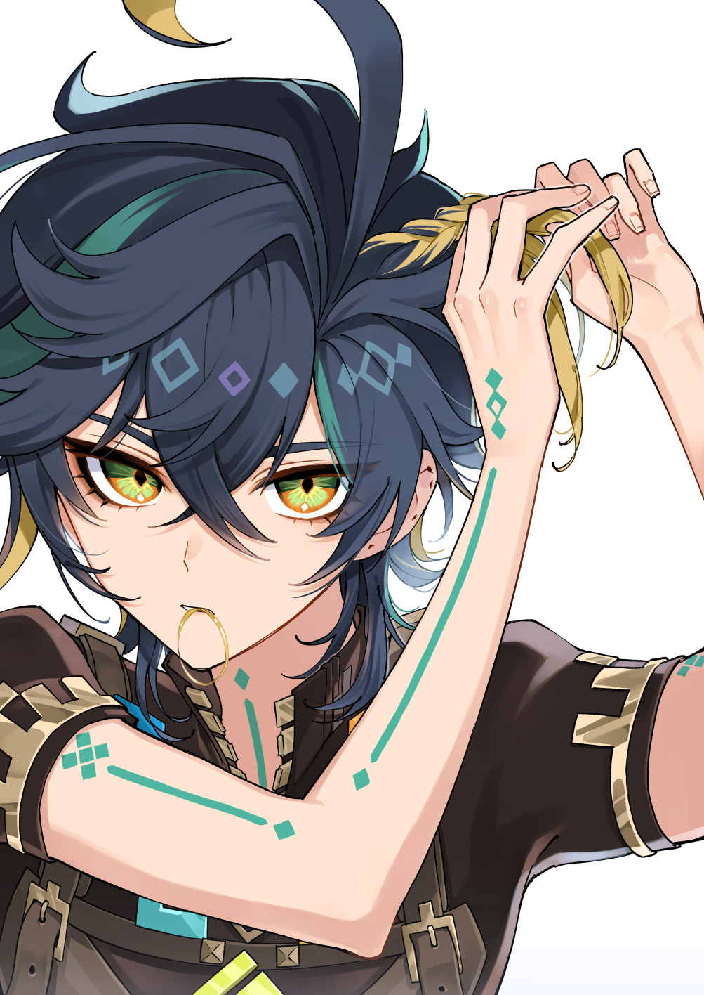 1boy adjusting_hair black_hair black_shirt blonde_hair blue_hair braiding_hair crossed_bangs genshin_impact green_eyes green_hair hair_between_eyes hair_tie_in_mouth hairdressing highres kinich_(genshin_impact) looking_at_viewer male_focus mouth_hold multicolored_eyes multicolored_hair shirt short_sleeves simple_background solo tabidachinimiz upper_body white_background yellow_eyes