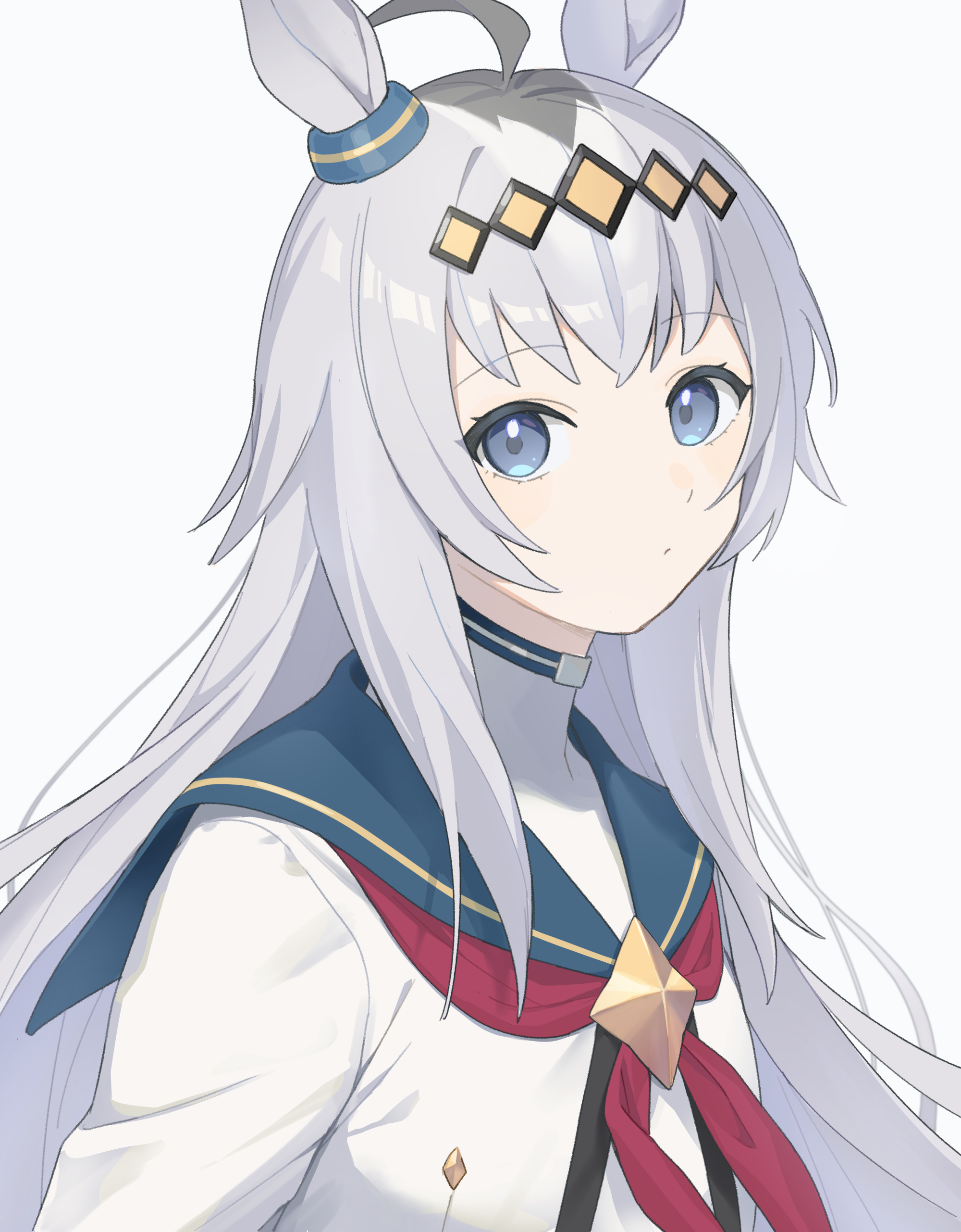 1girl absurdres ahoge animal_ears blue_eyes blue_sailor_collar brooch closed_mouth commentary_request ear_ornament gomi_(kaiwaresan44) grey_hair hair_between_eyes hairband highres horse_ears horse_girl jacket jewelry long_hair long_sleeves looking_at_viewer multicolored_hair neckerchief oguri_cap_(starlight_beat)_(umamusume) oguri_cap_(umamusume) red_neckerchief sailor_collar shirt simple_background solo star_brooch umamusume upper_body white_shirt