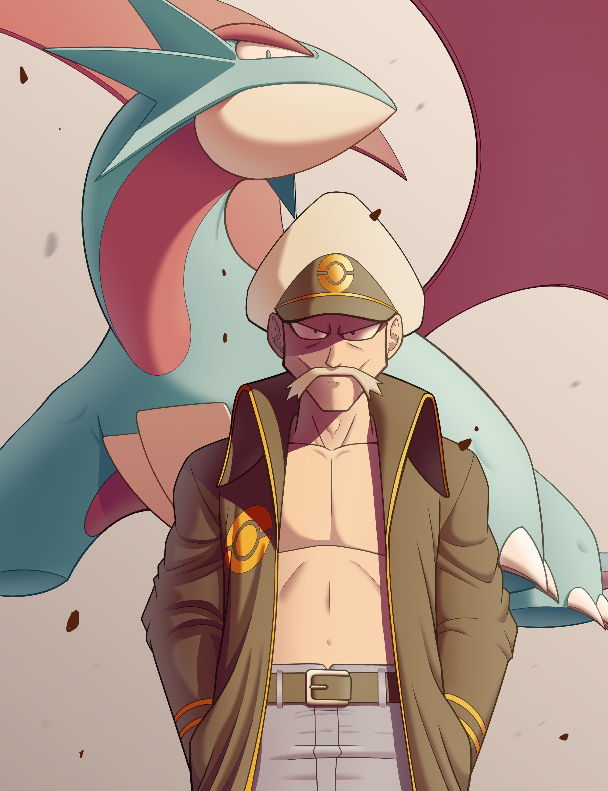 1boy absurdres belt black_belt black_coat blue_pants closed_mouth coat collarbone commentary_request dragon drake_(pokemon) facial_hair gen_3_pokemon hands_in_pockets hat highres kihada_magulo looking_at_viewer male_focus mustache navel nintendo open_clothes open_coat pants pokemon pokemon_(creature) pokemon_ruby/sapphire/emerald salamence topless_male white_hat wings