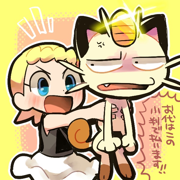 1girl anger_vein aqua_eyes blonde_hair blush bonnie_(pokemon) coin commentary_request eyelashes fang gen_1_pokemon glint gold grey_shirt holding holding_pokemon koban_(gold) meowth nintendo notice_lines open_mouth outline pokemon pokemon_(anime) pokemon_(creature) pokemon_the_series:_xy shirt skirt sleeveless sleeveless_shirt smile translation_request tsunoji v-shaped_eyebrows white_outline white_skirt