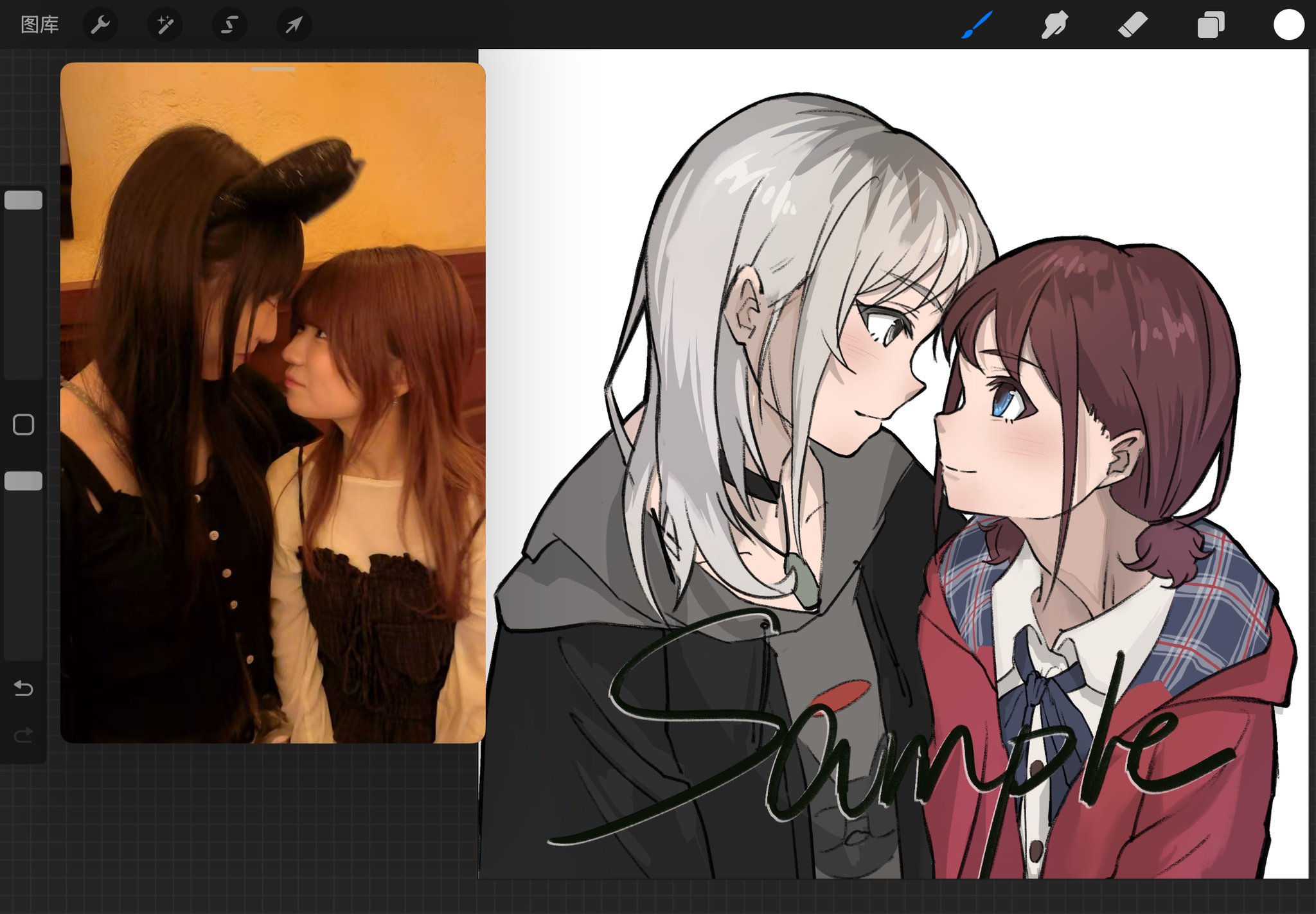 2girls art_program_in_frame black_choker black_jacket brown_hair choker closed_mouth commentary_request eye_contact girls_band_cry grey_eyes grey_hair grey_hoodie highres hood hood_down hoodie iseri_nina jacket kawaragi_momoka long_hair looking_at_another low_twintails multicolored_hair multiple_girls procreate_(medium) red_jacket reference_inset rina_(voice_actor) roots_(hair) shirt short_hair short_twintails twintails voice_actor voice_actor_connection white_shirt yuri yuri_(voice_actor) zhuahen1215