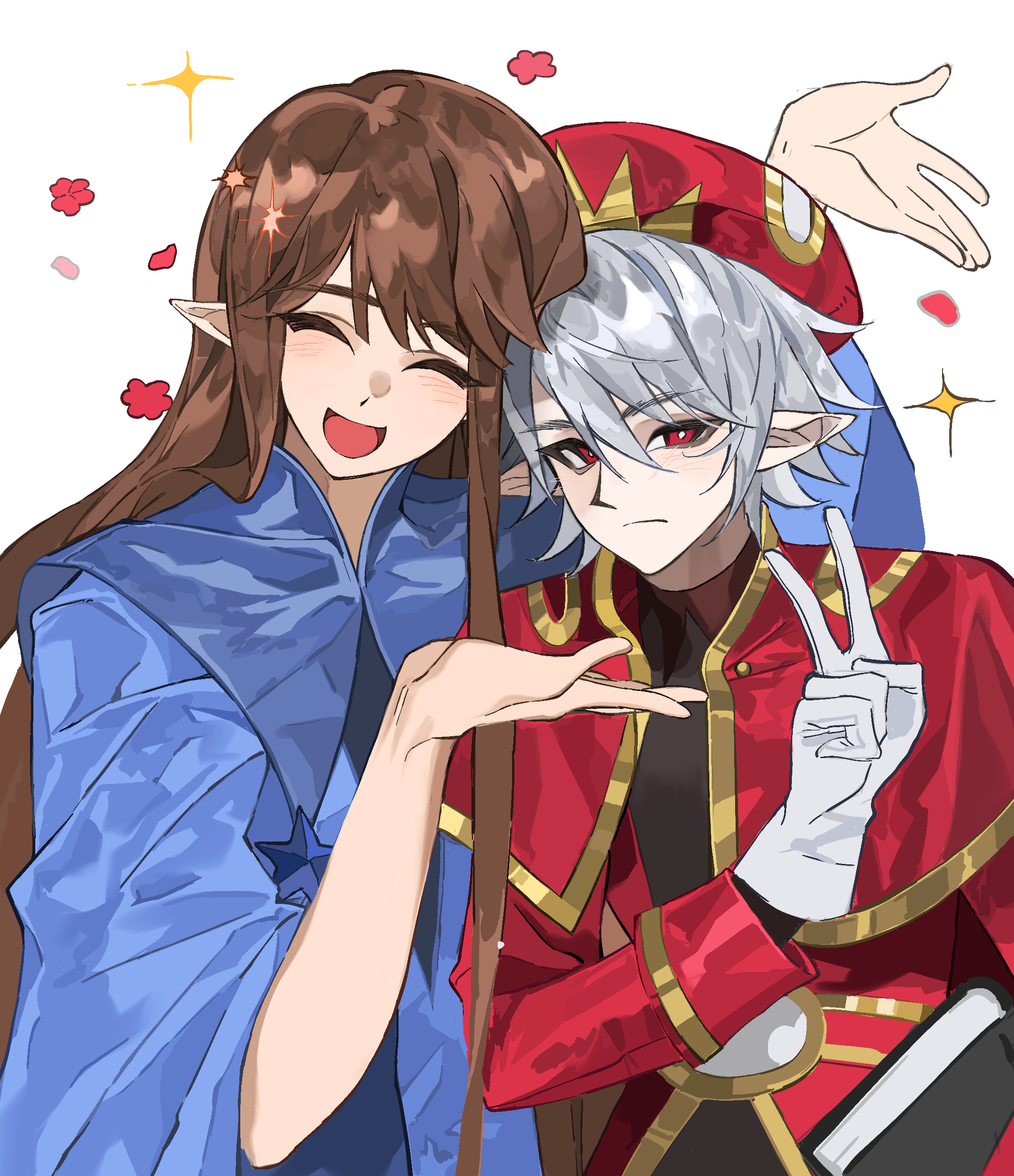 1boy 1girl absurdres blush book brown_hair capelet chinese_commentary closed_eyes commentary_request enzo_(roco_kingdom:world) gloves grey_hair hat highres long_hair looking_at_viewer mengyou_saojie open_mouth pointy_ears red_eyes roco_kingdom roco_kingdom:_world sherry_(roco_kingdom:_world) smile sparkle v white_background white_gloves white_hair