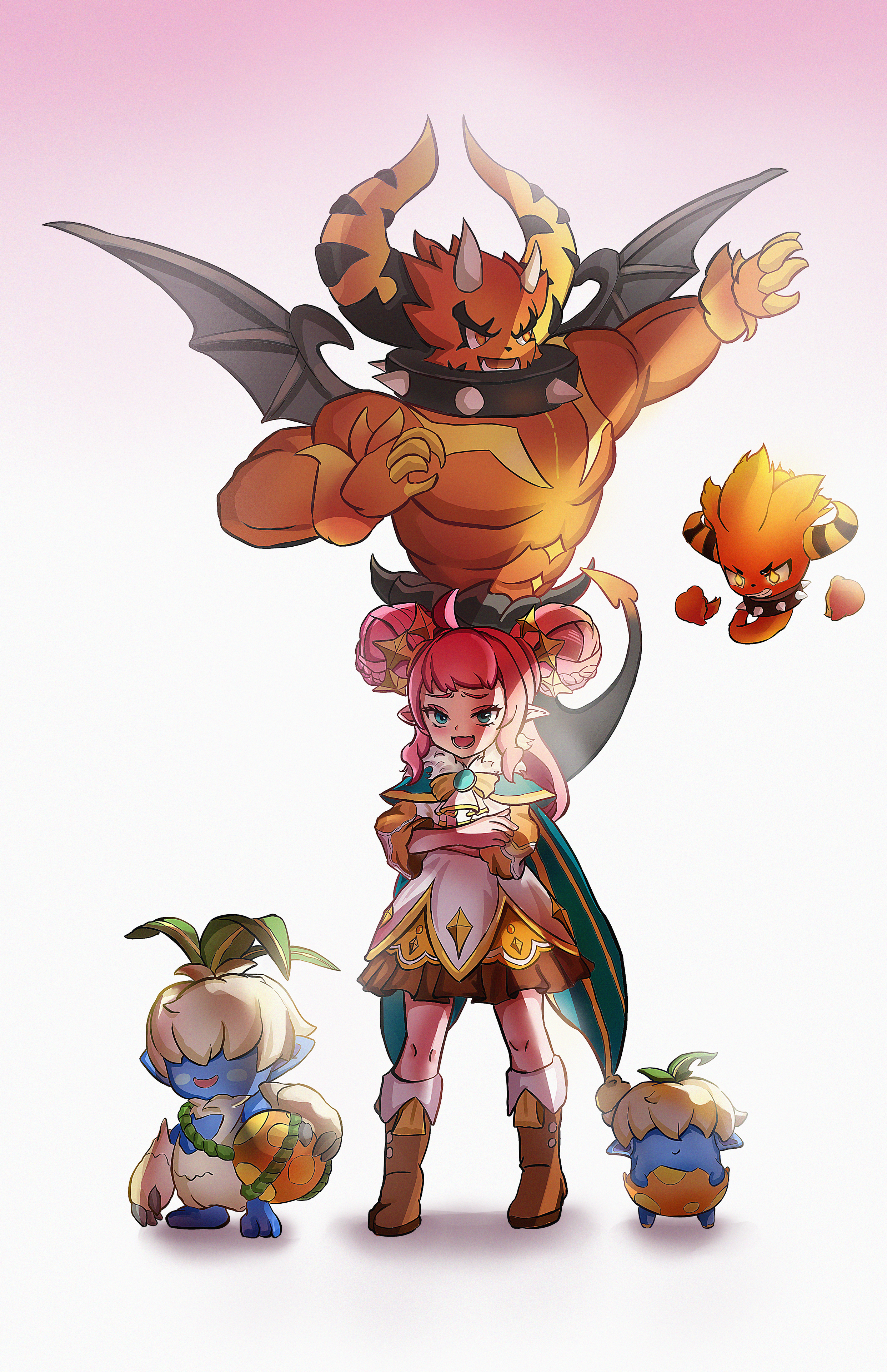 1boy 1girl absurdres ahoge blue_eyes boots bracelet cape chinese_commentary collar colored_skin commentary_request crossed_arms double_bun dress fangs full_body gradient_background hair_bun hair_ornament highres holding horns jewelry krithia_(roco_kingdom:_world) long_hair open_mouth pink_hair pointy_ears red_hair roco_kingdom:_world simple_background skirt smile spiked_bracelet spiked_collar spikes standing tail white_background wings xingwei_yishudashi
