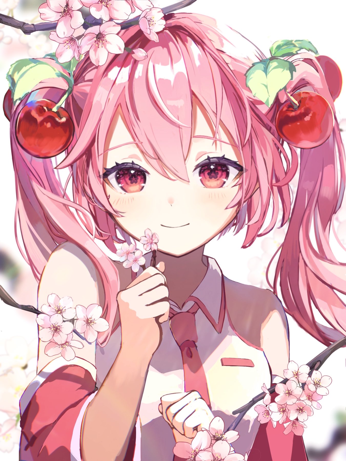 1girl apple character_request cherry_blossoms commentary_request copyright_request dress flower food fruit highres n_karakure necktie outdoors pink_dress pink_eyes pink_hair pink_necktie shirt simple_background smile solo twintails upper_body white_background white_shirt