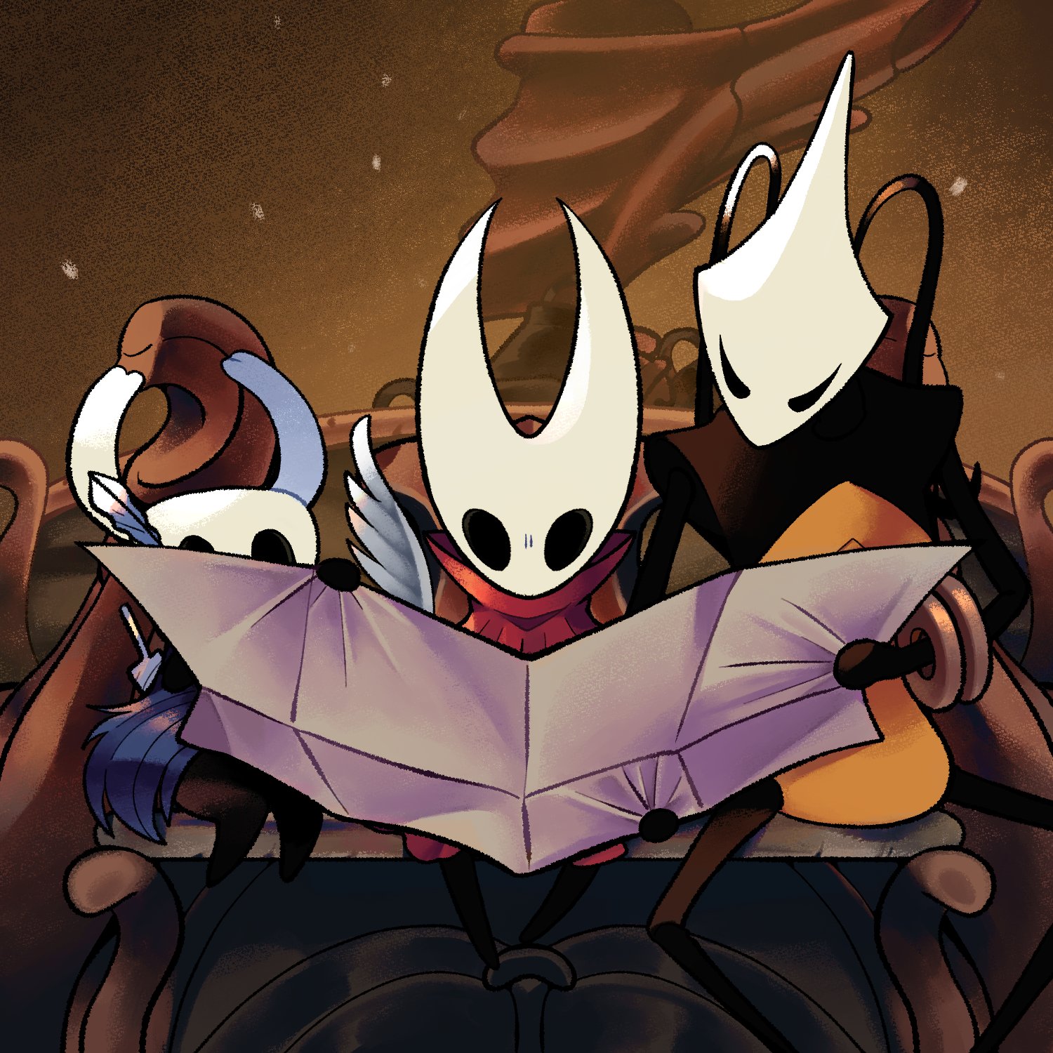 1other 2girls antennae arthropod_girl bench black_eyes brown_background chakram cloak commentary gorusiti7 grey_cloak highres holding holding_map hollow_knight hollow_knight:_silksong hornet_(hollow_knight) horns in-universe_location knight_(hollow_knight) looking_at_map map multiple_girls quill red_cloak shakra_(hollow_knight) sitting weapon