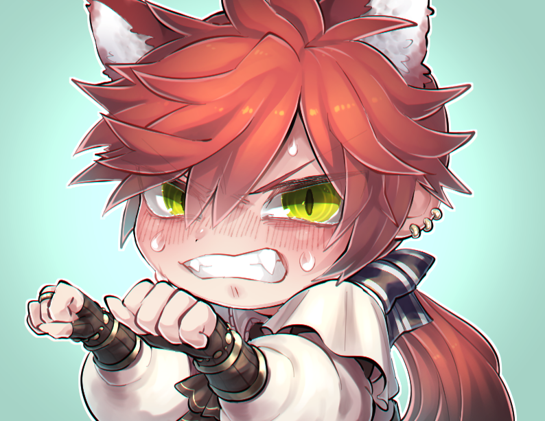 1boy animal_ear_fluff animal_ears aqua_background ascot brown_ascot cat_ears charles_perrault_(grimms_notes) charles_perrault_(original)_(grimms_notes) chibi chibi_only clenched_teeth green_eyes grimms_notes hair_ribbon long_hair long_sleeves looking_at_viewer low_ponytail male_focus outline paw_pose ponytail puffy_long_sleeves puffy_sleeves red_hair ribbon shirt slit_pupils solo spiked_hair striped_ribbon sweat teeth white_outline white_shirt yako_(pzy)