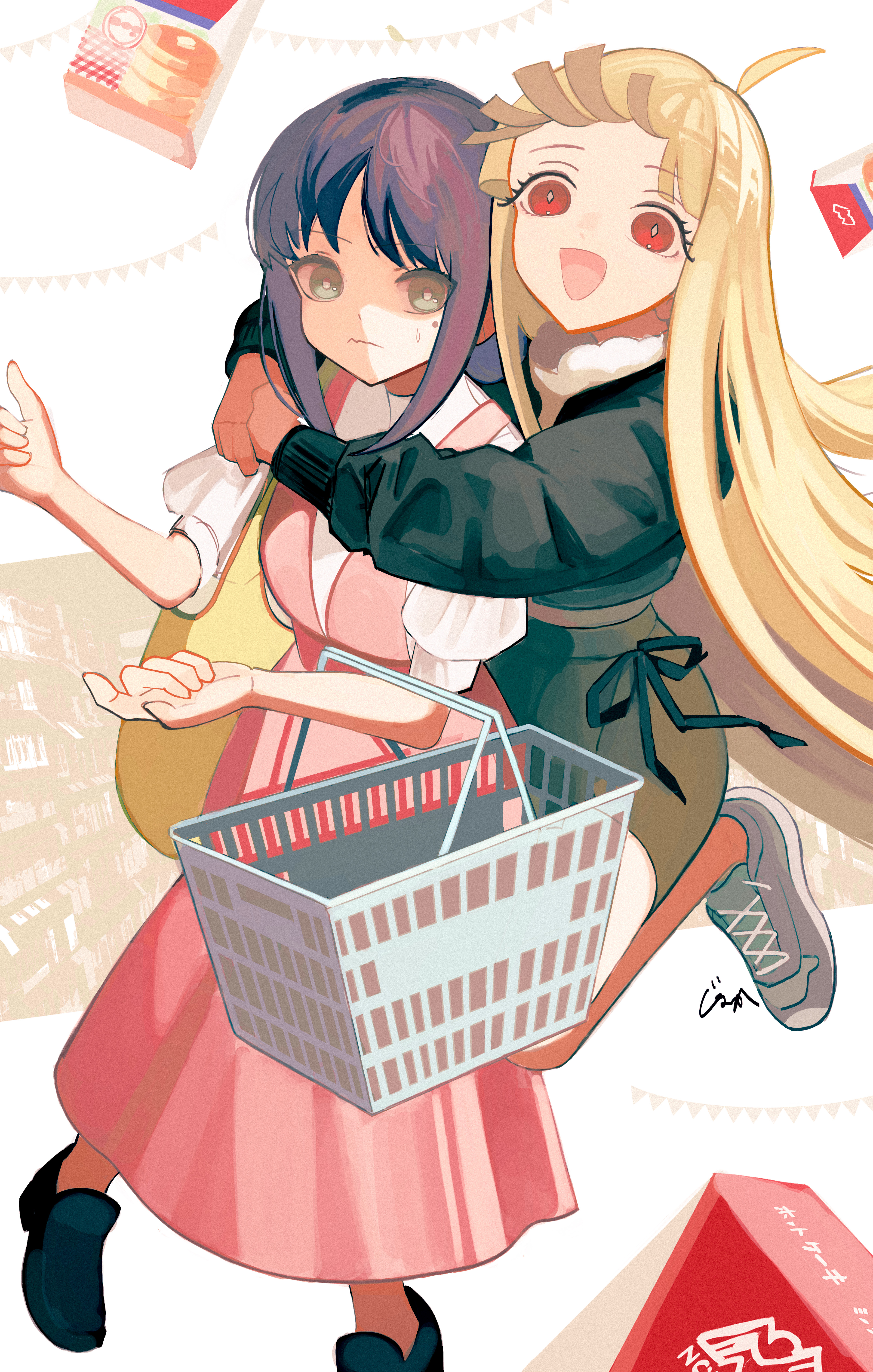 2girls absurdres black_jacket cho_kaguya-hime! closed_mouth commentary dress film_grain green_eyes grey_skirt highres hug hug_from_behind jacket jinaka_(bagel7458) kaguya_(cho_kaguya-hime!) long_hair mole mole_under_eye multiple_girls open_mouth pink_dress pink_hair red_eyes sakayori_iroha shirt shopping_basket short_hair skirt sweatdrop wavy_mouth white_shirt