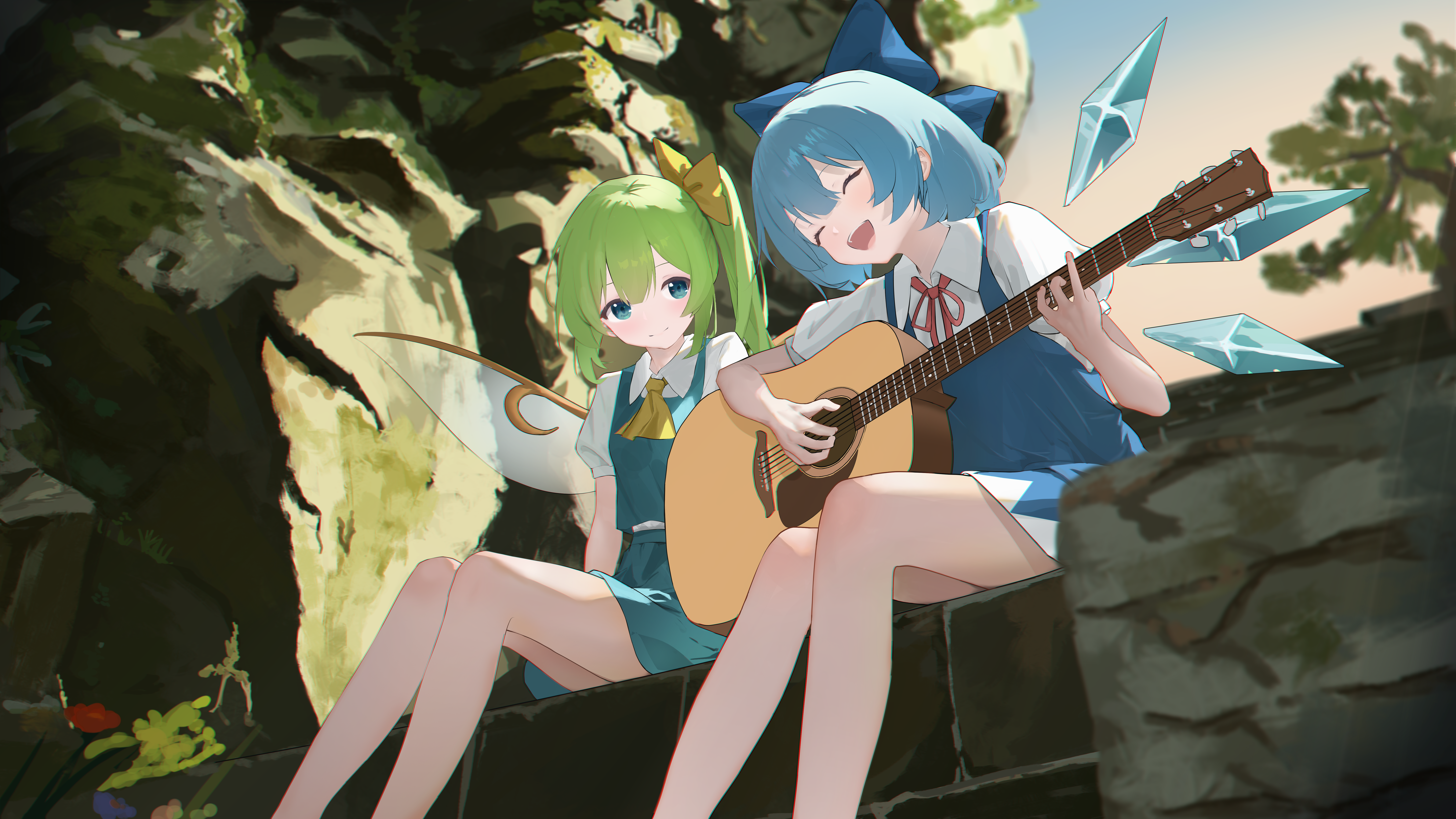 2girls absurdres ascot blue_bow blue_dress blue_hair blue_skirt blue_vest bow cirno closed_eyes closed_mouth collared_shirt commentary commentary_request daiyousei detached_wings dress english_commentary fairy fairy_wings green_hair guitar hair_bow highres holding holding_guitar holding_instrument ice ice_wings instrument medium_hair mixed-language_commentary multiple_girls music neck_ribbon open_mouth outdoors pinafore_dress playing_instrument puffy_short_sleeves puffy_sleeves rareguy_2m red_ribbon ribbon shirt short_sleeves side_ponytail sitting skirt sleeveless sleeveless_dress smile touhou vest white_shirt wings yellow_ascot yellow_bow