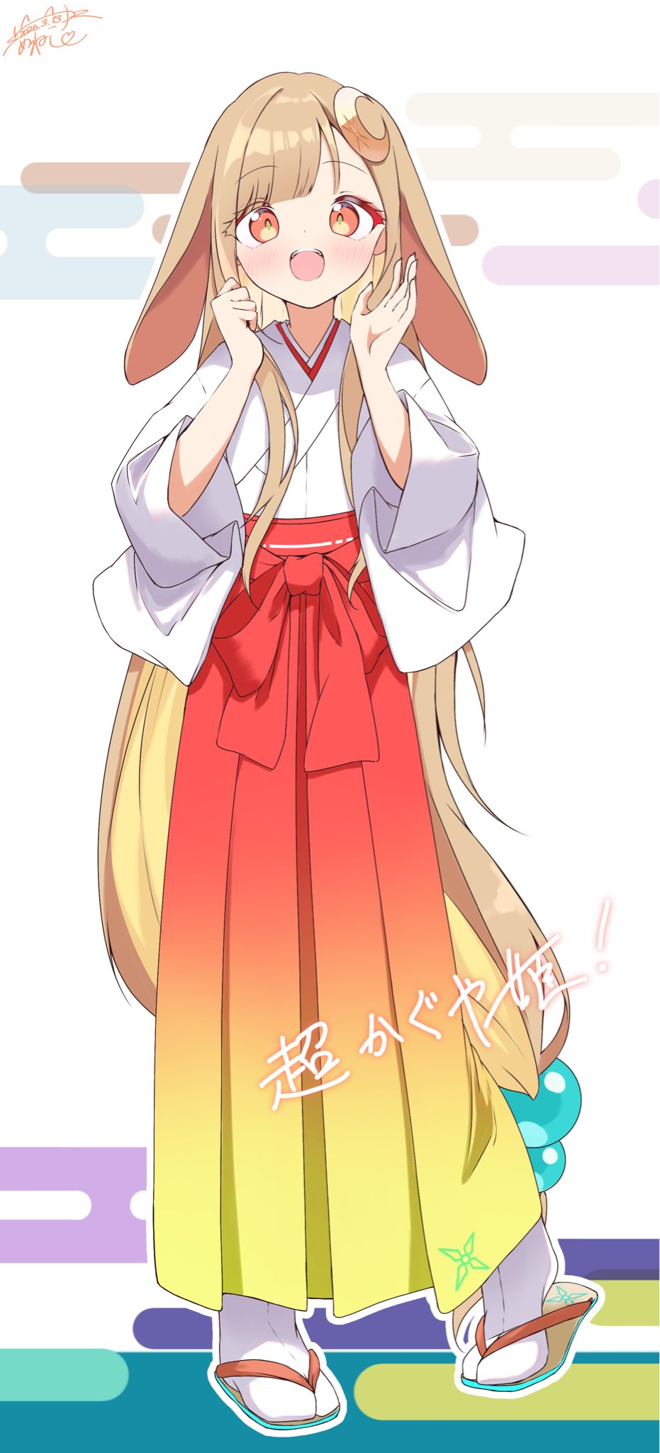 1girl :d animal_ears blonde_hair cho_kaguya-hime! commentary_request copyright_name egasumi full_body gradient_hakama hakama hakama_skirt hands_up highres japanese_clothes kaguya_(cho_kaguya-hime!) kimono long_hair long_sleeves looking_at_viewer lop_rabbit_ears miko open_mouth orange_eyes rabbit_ears red_hakama skirt smile socks solo standing tabi translation_request white_kimono white_socks wide_sleeves yumineko_(yukimasa1017)