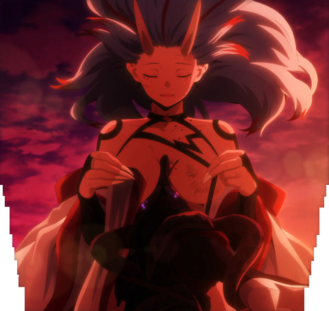 1girl absurdres anime_screenshot armpits black_panties black_thighhighs blue_eyes blue_hair breasts cape fangs hands_up highres horns kuusetsu large_breasts long_hair mato_seihei_no_slave multicolored_hair non-web_source open_clothes panties red_hair simple_background thighhighs tongue two-tone_hair underwear very_long_hair white_background white_cape