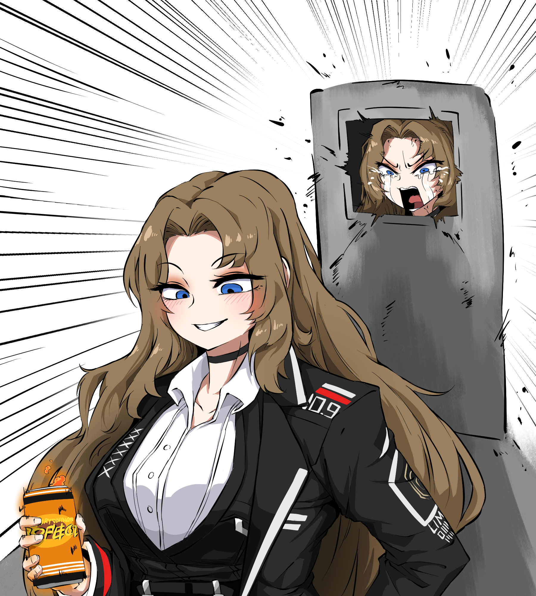 2girls black_choker blue_eyes breasts brown_hair can choker commentary_request crying crying_with_eyes_open drink_can grin highres holding holding_can interstellar_(movie) jungeorl korean_commentary limbus_company long_hair long_sleeves looking_at_another movie_reference multiple_girls project_moon rodion_(project_moon) screaming shirt smile tears white_shirt