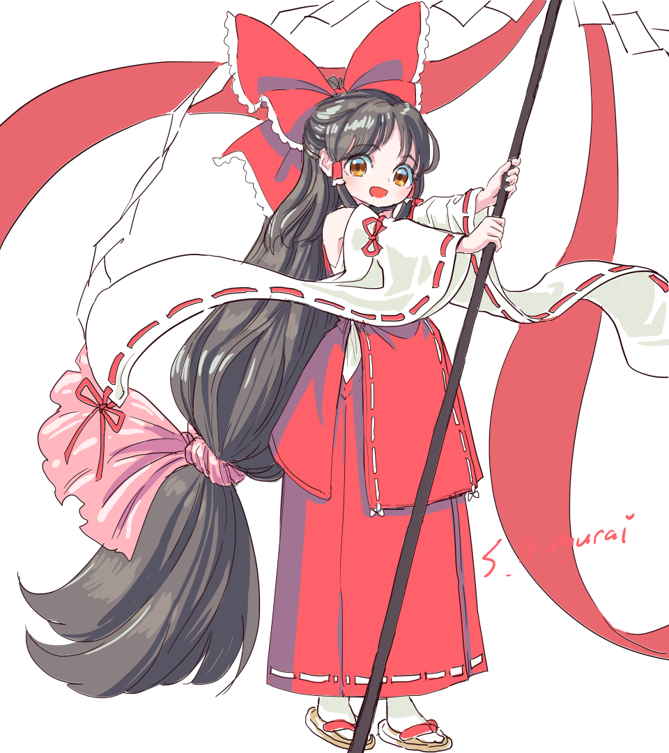 1girl adapted_costume alternate_hair_length alternate_hairstyle artist_name bow brown_eyes brown_hair brown_sandals commentary_request detached_sleeves frilled_bow frilled_hair_tubes frills gohei hair_bow hair_tubes hakurei_reimu holding holding_gohei long_hair looking_at_viewer multi-source_commentary open_mouth red_bow red_skirt ribbon-trimmed_sleeves ribbon_trim s-a-murai sandals skirt skirt_set smile socks solo touhou very_long_hair white_socks