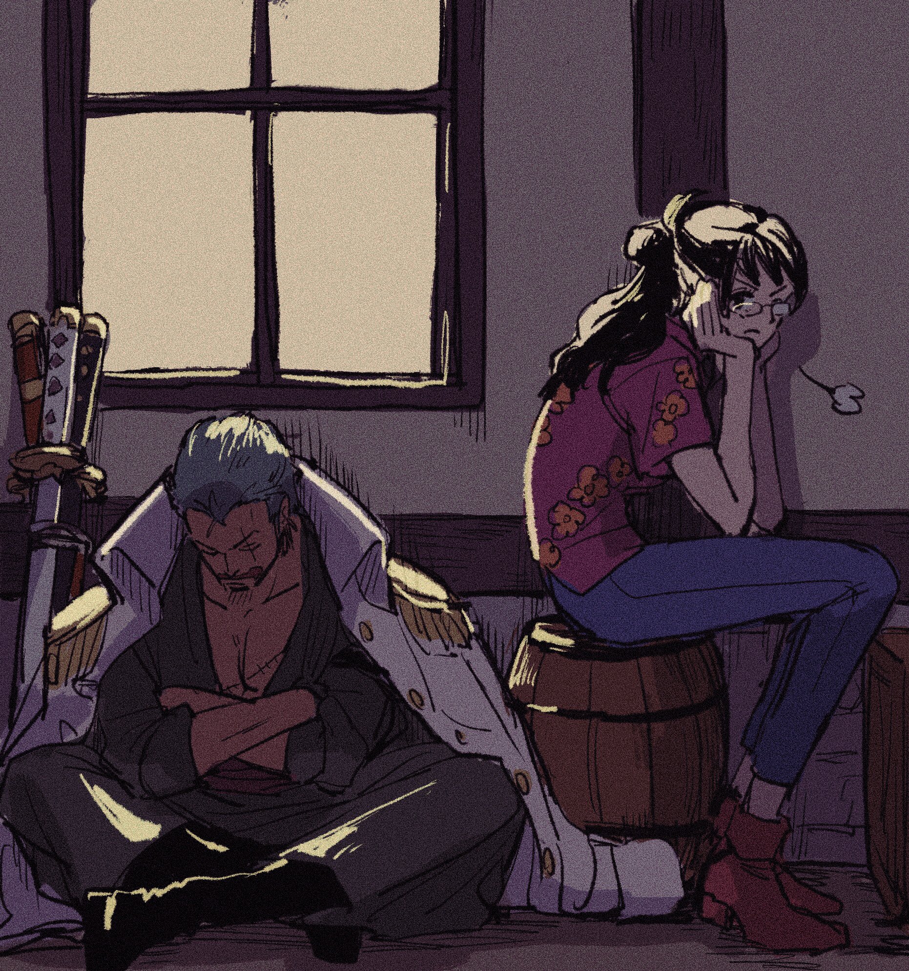 1boy 1girl abunaideka barrel black_hair blue_pants coat commentary_request crossed_arms glasses green_hair highres one_piece pants ponytail purple_shirt roronoa_zoro shirt short_hair sitting stitched_torso stitches sword tashigi weapon white_coat window
