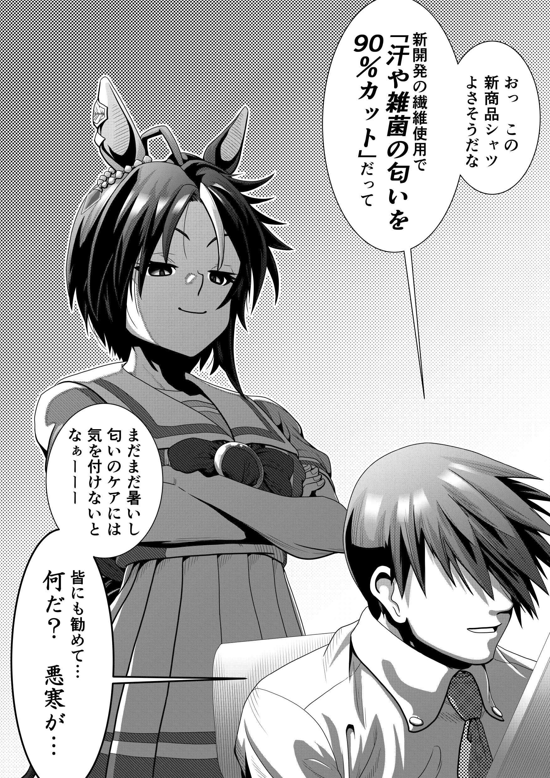 1boy 1girl absurdres animal_ears behind_another bow bowtie closed_mouth collared_shirt commentary_request covered_eyes crossed_arms dress_shirt ear_ornament fuji_kiseki_(umamusume) greyscale hair_over_eyes high-waist_skirt highres horse_ears j_stonewalker jewelry looking_at_another monochrome multicolored_hair necktie parted_lips pleated_skirt school_uniform shaded_face shirt short_hair short_sleeves skirt smile tracen_school_uniform trainer_(umamusume) translation_request two-tone_hair umamusume wing_collar
