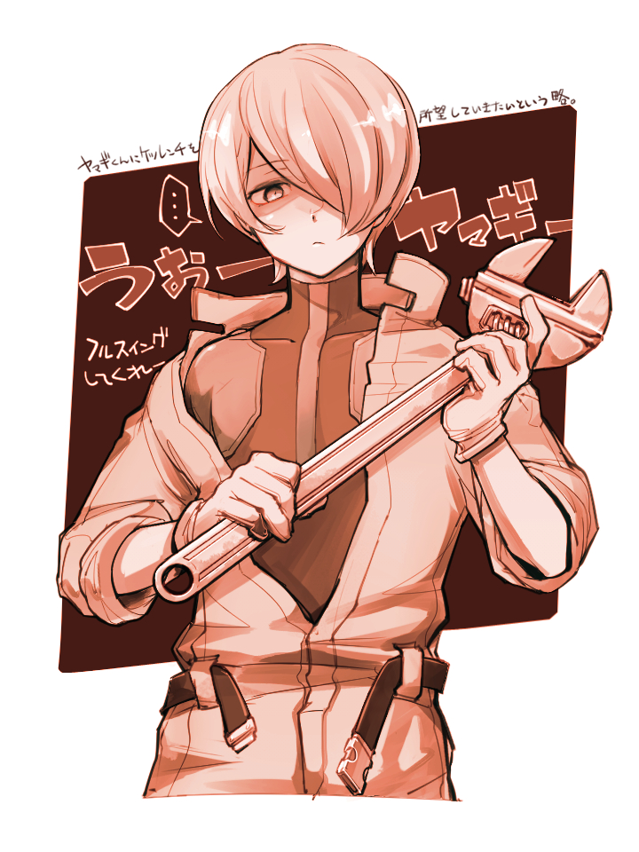 1boy closed_mouth commentary_request cropped_legs gloves gundam gundam_tekketsu_no_orphans hair_over_one_eye holding holding_wrench jumpsuit long_sleeves looking_at_viewer male_focus mecyo_(mamezurushiki) monochrome short_hair solo translation_request wrench yamagi_gilmerton