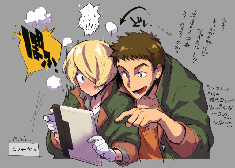 2boys arrow_(symbol) blonde_hair blush brown_hair coat commentary_request earrings embarrassed green_coat grey_background gundam gundam_tekketsu_no_orphans hair_over_one_eye holding holding_tablet_pc jewelry male_focus mecyo_(mamezurushiki) multiple_boys norba_shino open_mouth orange_shirt pointing shirt short_hair speech_bubble tablet_pc translation_request yamagi_gilmerton