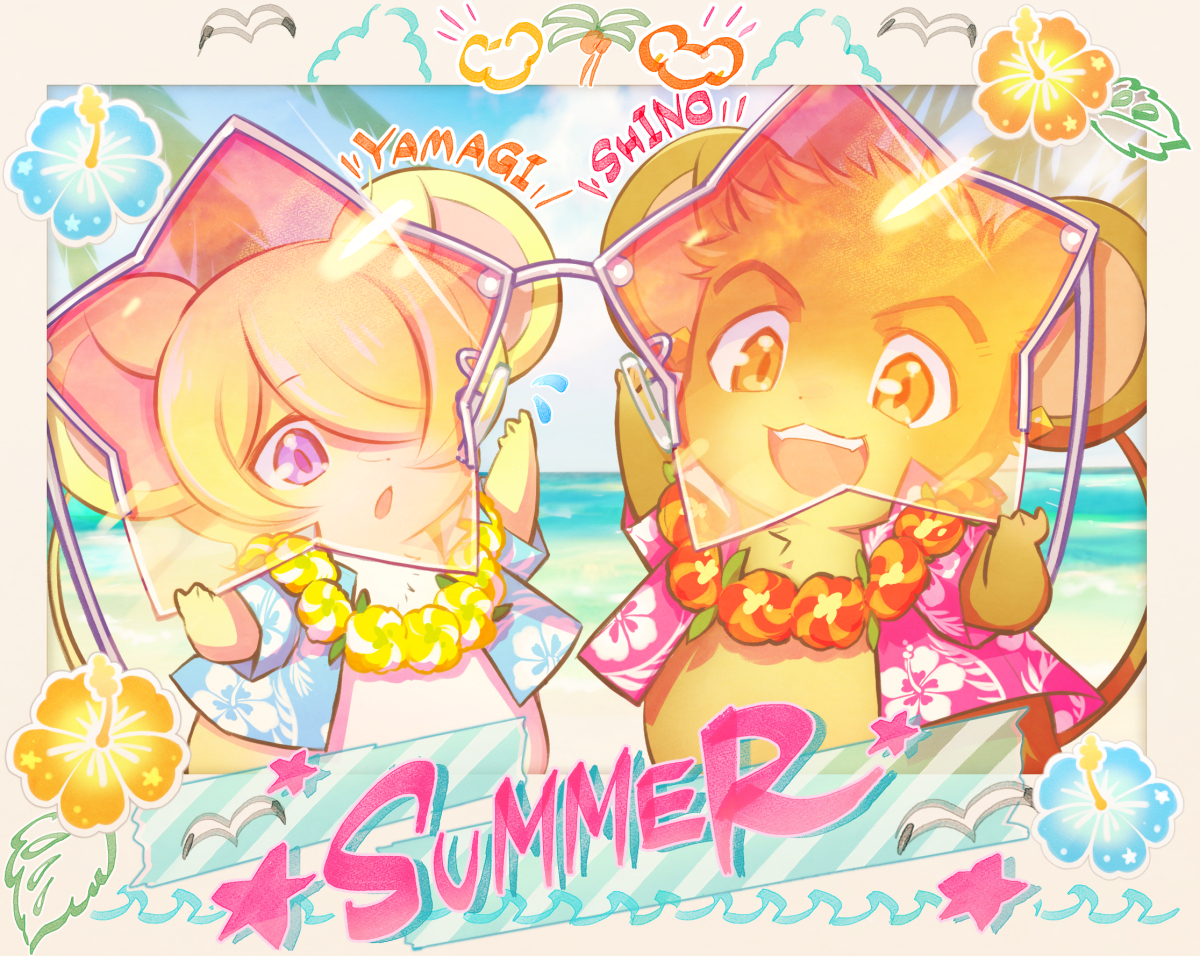 animalization blonde_hair brown_eyes character_name commentary_request flower flower_necklace gundam gundam_tekketsu_no_orphans hair_over_one_eye hawaiian_shirt jewelry lei mecyo_(mamezurushiki) mouse_(animal) necklace no_humans norba_shino open_mouth purple_eyes shirt star-shaped_eyewear star_(symbol) summer yamagi_gilmerton