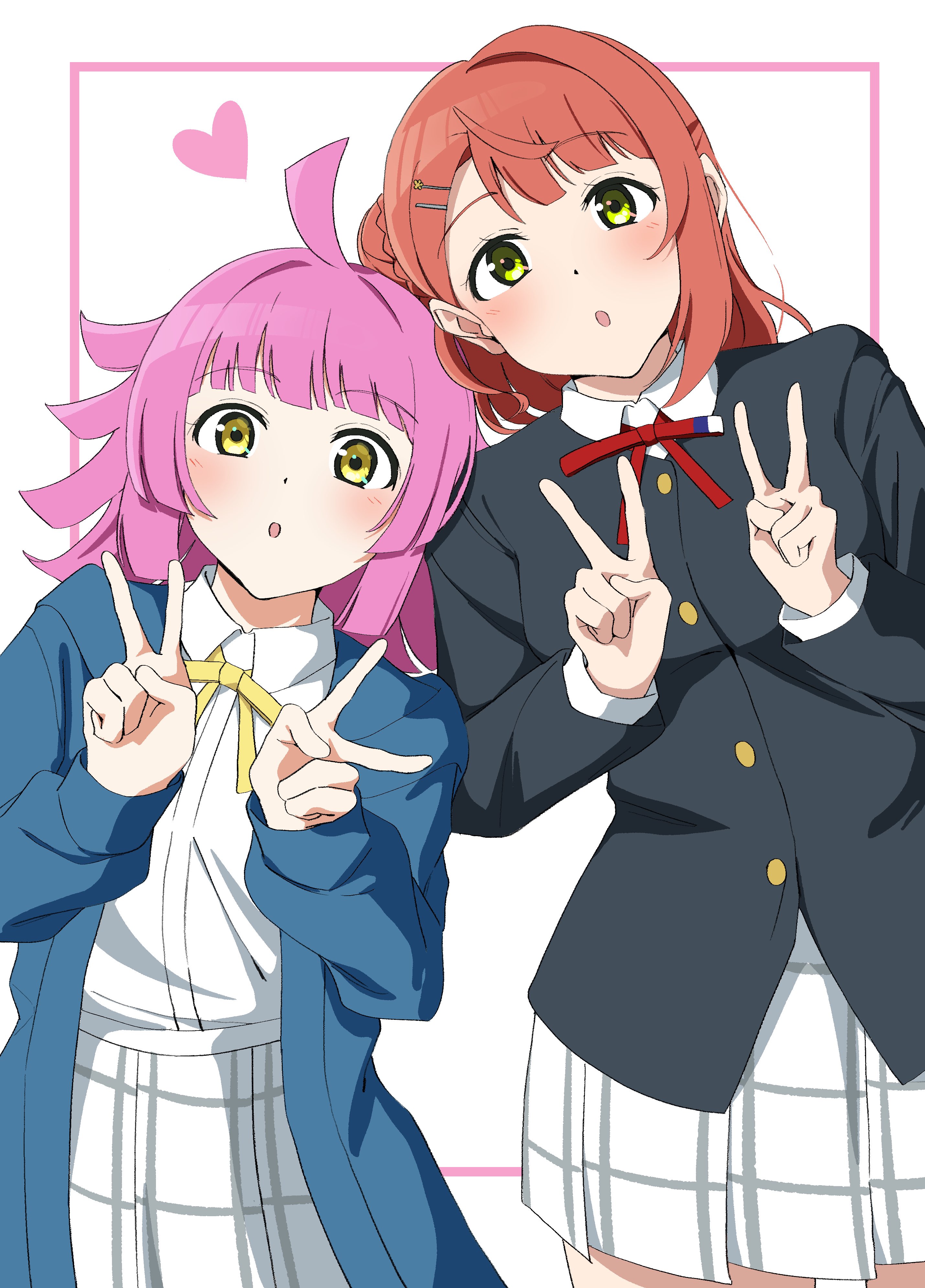 2girls :o absurdres ahoge black_jacket blue_jacket blunt_bangs blunt_ends blush border collared_shirt cowboy_shot double_v green_eyes hair_ornament hairclip hands_up heart highres hood hood_down hooded_jacket inset_border jacket kishimen_hair leaning_to_the_side long_sleeves looking_at_viewer love_live! love_live!_nijigasaki_high_school_idol_club multiple_girls neck_ribbon nijigasaki_school_uniform open_clothes open_jacket open_mouth orange_hair outside_border parallel_hairclips pink_border pink_hair pleated_skirt red_ribbon ribbon school_uniform shirt simple_background skirt sleeves_past_wrists standing tennoji_rina uchuu_no_mozuku uehara_ayumu v white_background white_shirt white_skirt winter_uniform yellow_eyes yellow_ribbon